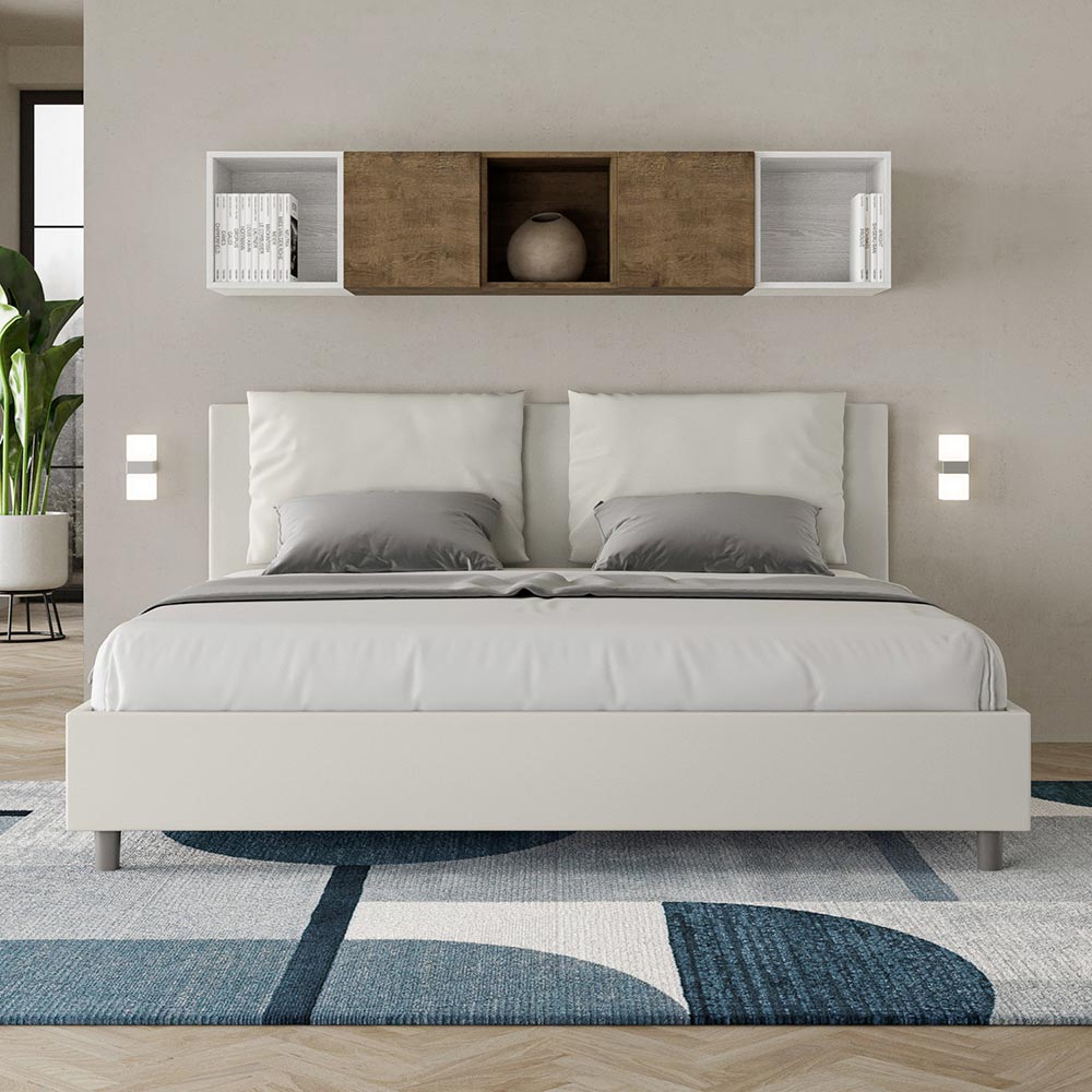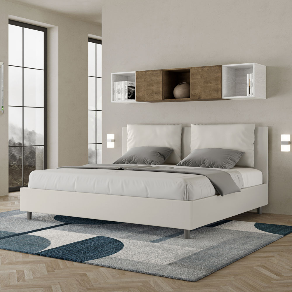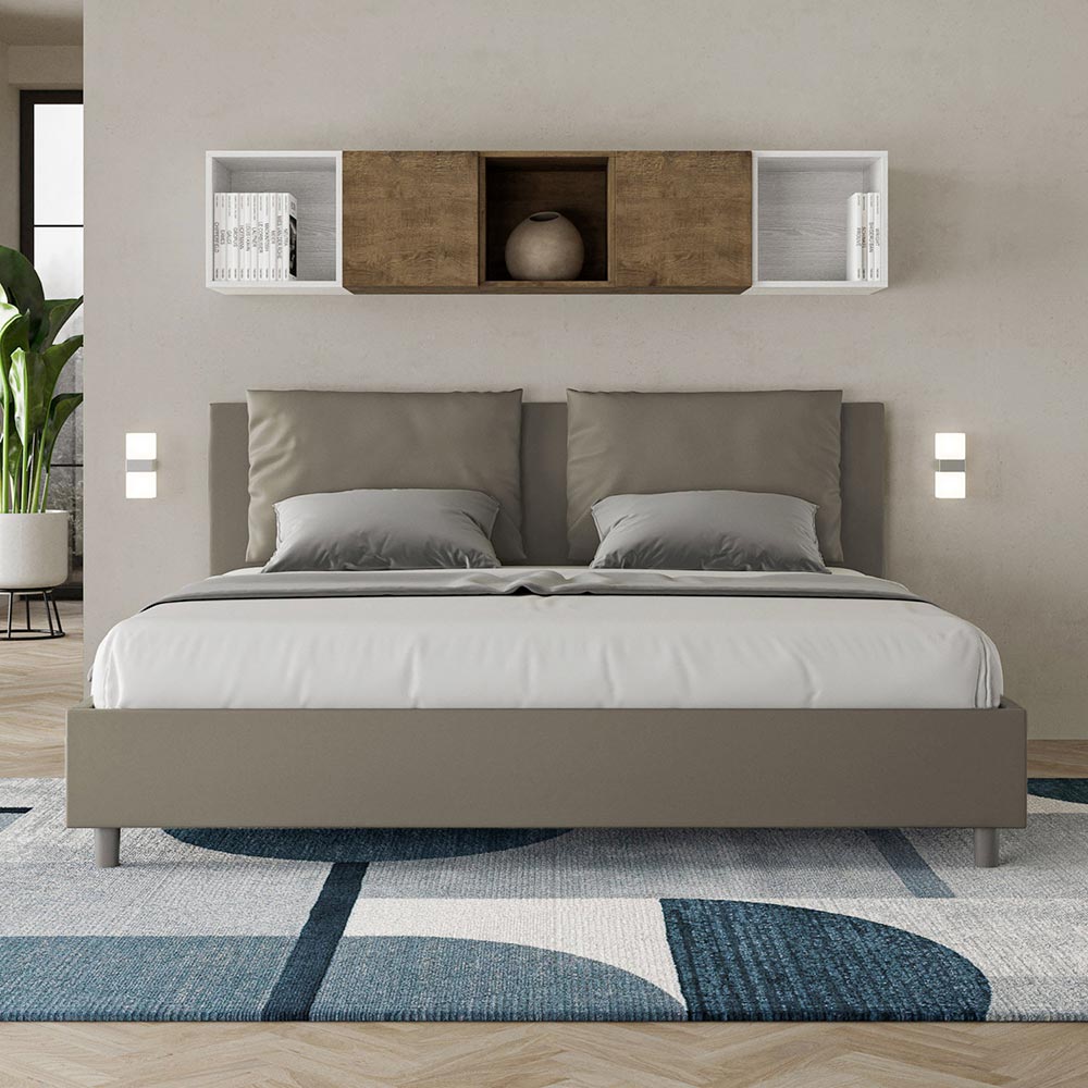 Kingsize-Bett 180x200 cm, gepolstert aus Melaminplatten und mit Kunstleder bezogen, vollständig in Italien hergestellt. Dieses Kingsize-Bett mit gepolstertem Rahmen vereint die Vorteile eines Polsterbetts: Komfort, modernes Design, Funktionalität und optimale Raumnutzung . Das großzügig gepolsterte Kopfteil bietet eine gemütliche Leseecke oder einen bequemen Fernsehplatz und wertet Ihr Schlafzimmer auf. Das elegante und stilvolle Bett ist mit Kunstleder bezogen und lässt sich daher schnell und einfach reinigen: Wischen Sie es einfach mit einem Mikrofasertuch ab, um es strahlend sauber zu halten.