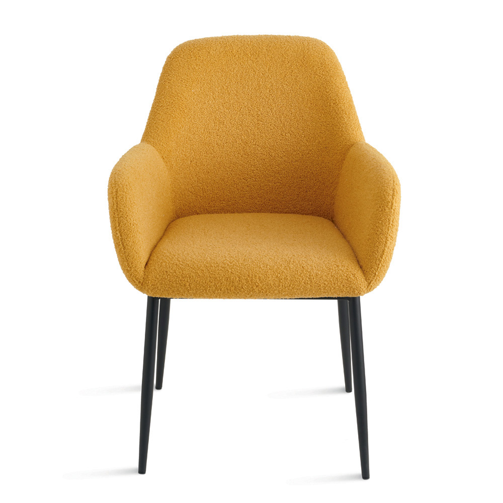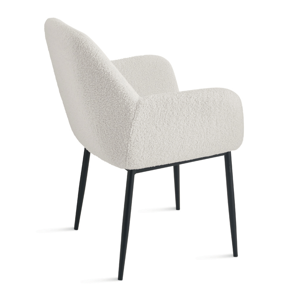Der Stuhl verfügt über eine breite, bequeme Sitzfläche mit integrierten Armlehnen und besticht durch seine kompakte, geometrische Form, die für hohen Sitzkomfort im Alltag sorgt. Der Bouclé-Stoff unterstreicht die Weichheit der Sitzfläche und schafft so ein perfektes Gleichgewicht zwischen Ästhetik und Funktionalität.