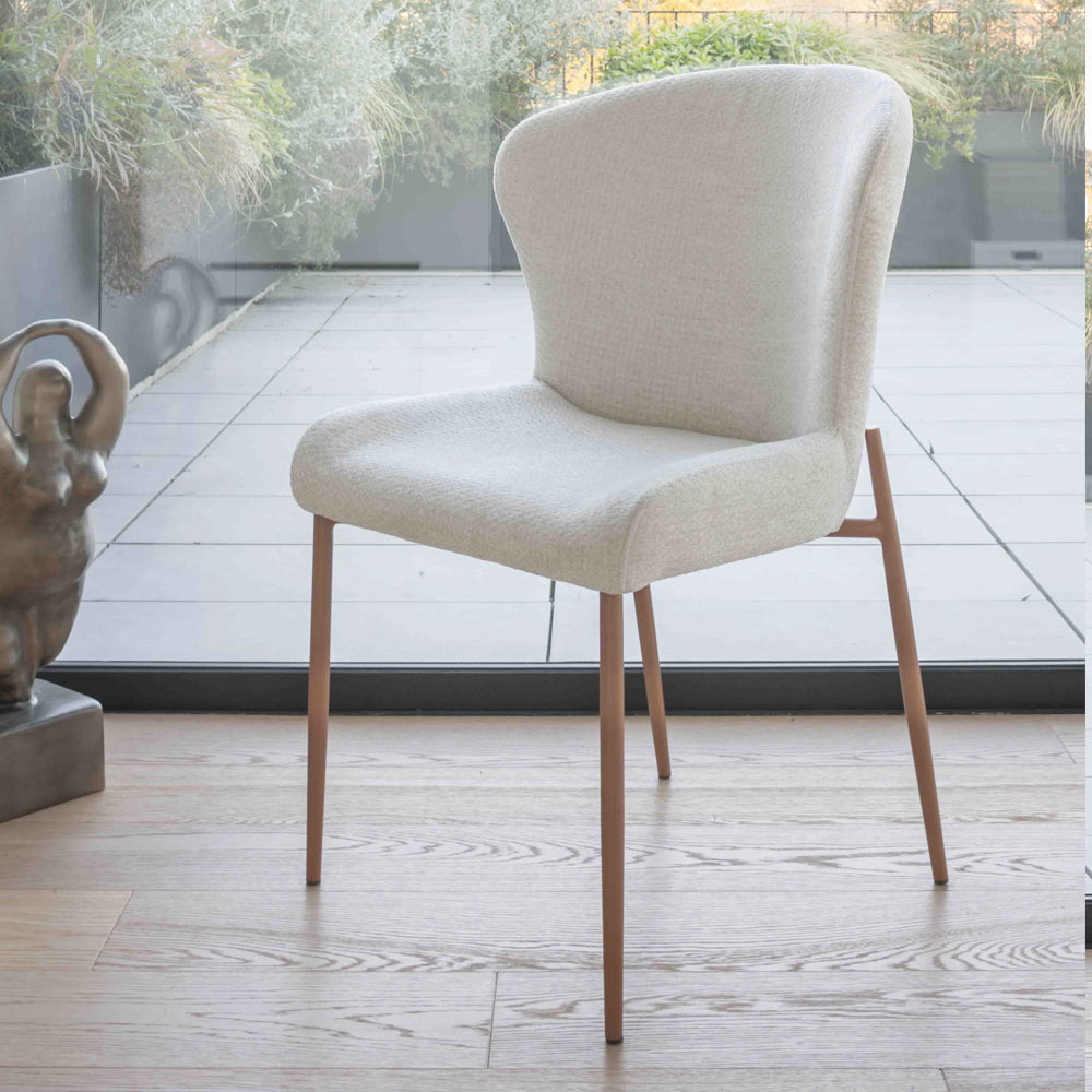 Dieser Stuhl vereint höchsten Komfort mit anspruchsvollem Design und ist ideal für moderne Räume mit gehobenem Anspruch. Die gepolsterte Sitzfläche und die geschwungene Rückenlehne bieten ergonomische Unterstützung und laden zum Entspannen ein, während der Stoffbezug dem Raum eine helle und behagliche Note verleiht. Die schlanken, harmonisch geformten Metallbeine bilden einen eleganten Kontrast zur Stoffstruktur und unterstreichen die Leichtigkeit und den modernen Charakter des Designs.
