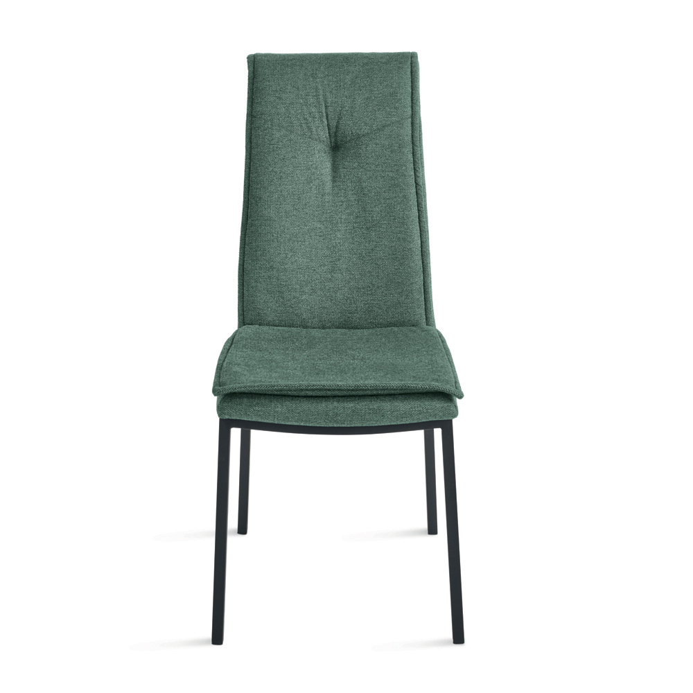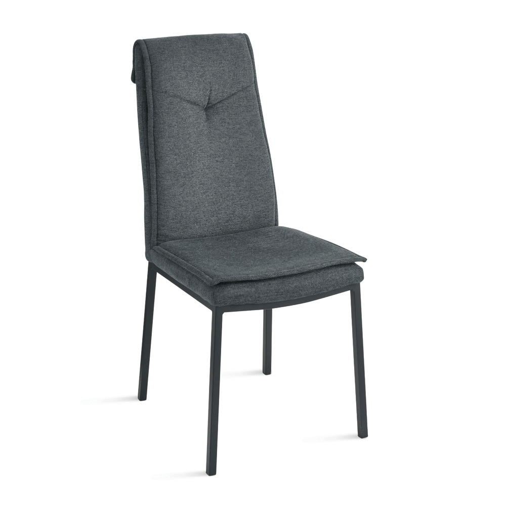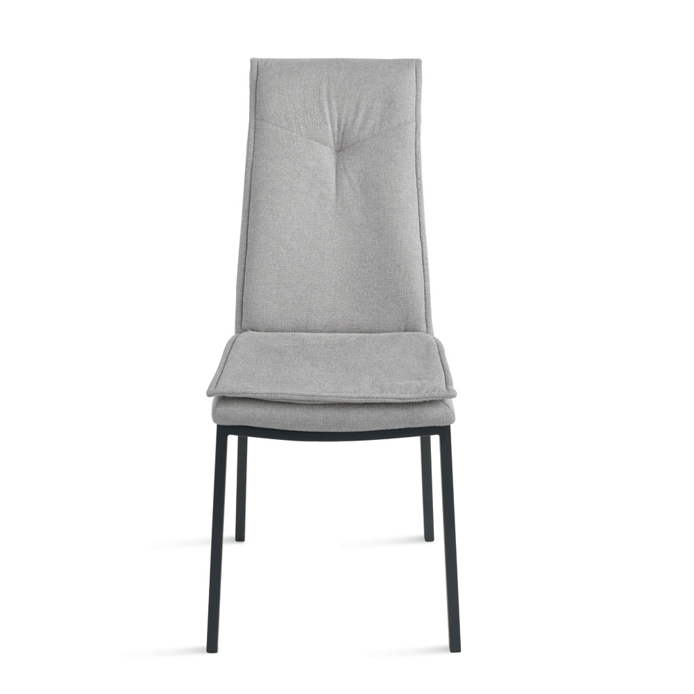 Der Stuhl zeichnet sich durch sein schlankes Profil und die hohe Rückenlehne aus, die Rücken und Schultern optimal stützt und so auch bei längerem Sitzen am Tisch für bequemes Sitzen sorgt. Die Polsterung ist mit Ziernähten in der Mitte der oberen Rückenlehne versehen – ein elegantes Detail, das das Design des Stuhls aufwertet.