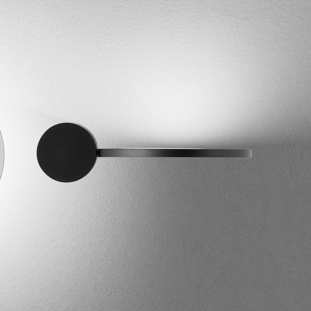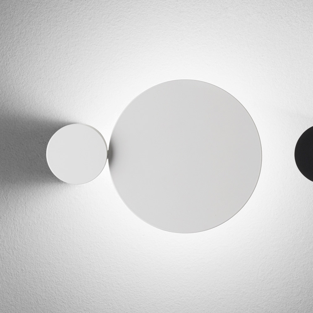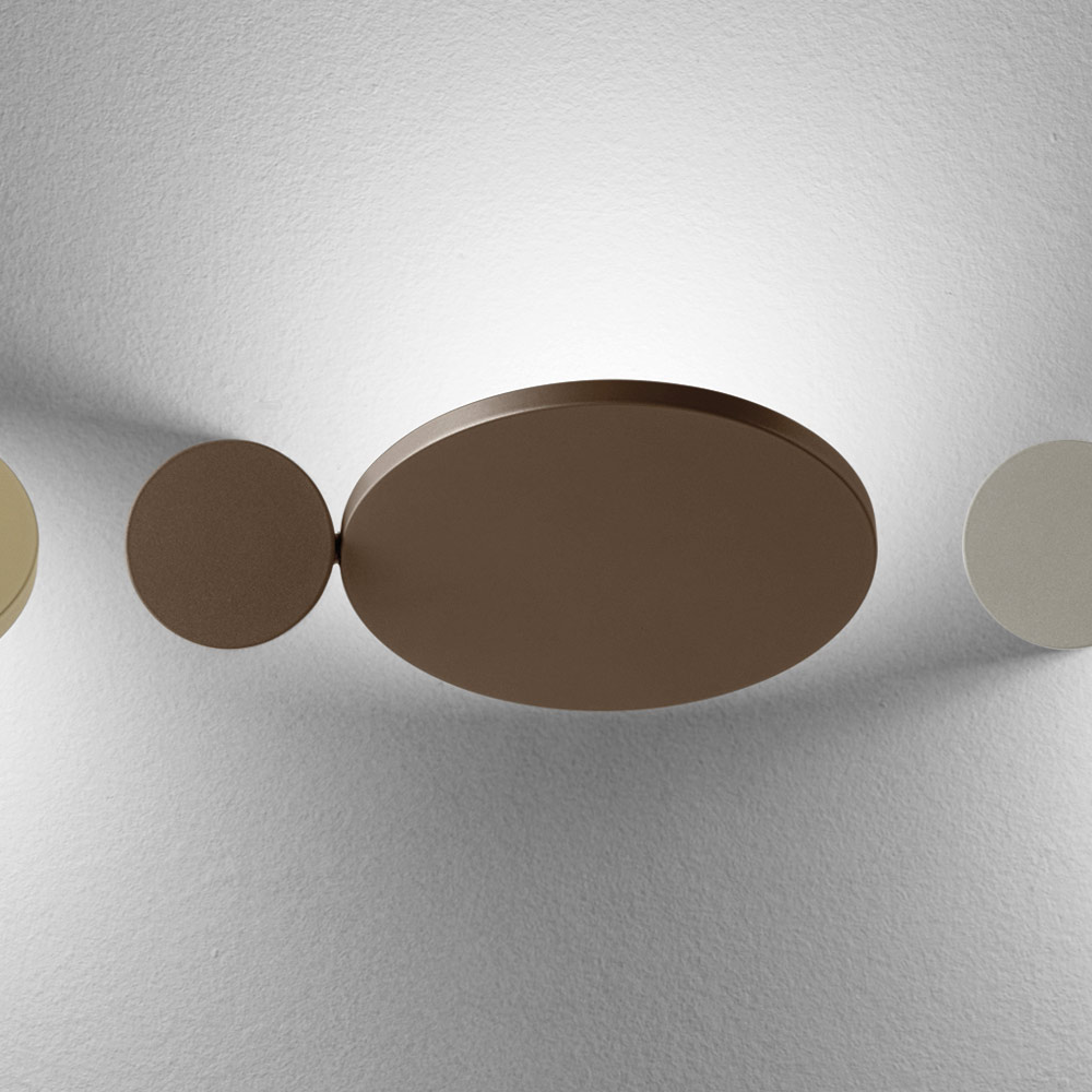 Diese Wandleuchte ist ein wahres leuchtendes Kunstwerk , das grafisches Design und dekorative Funktion in einer einzigen Geste vereint. Sie besteht aus essentiellen geometrischen Formen und spielt mit überlappenden Scheiben und Ovalen , die beim Einschalten einen sanften und dramatischen Lichteffekt an der Wand erzeugen.