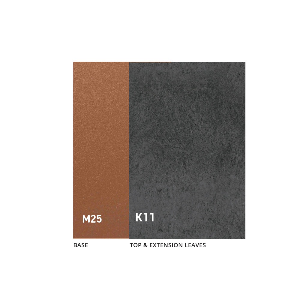 Tisch mit geprägtem, kupferfarben lackiertem Metallgestell und 3 mm starker Keramikplatte.