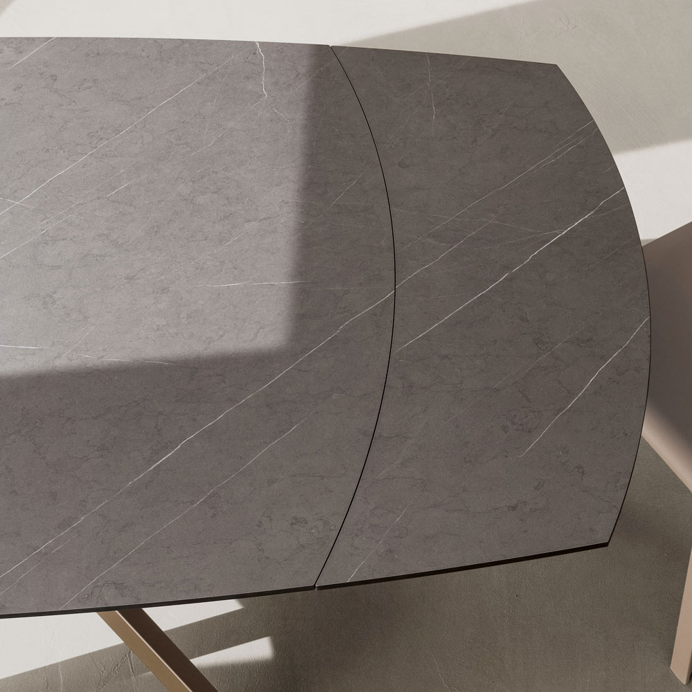 Die HPL- Platte ist elegant und widerstandsfähig . Dank des Ausziehmechanismus lässt sich der Tisch leicht und fließend von einer kompakten in eine breitere Form ausziehen, perfekt für den bequemen Empfang von Gästen.