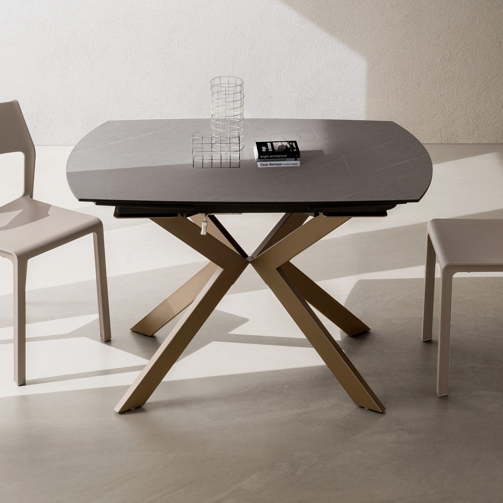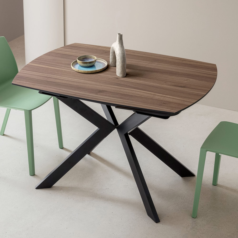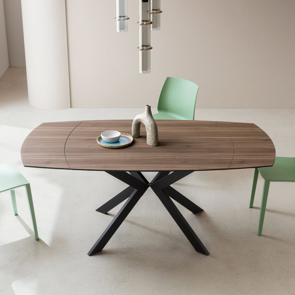 Der lackierte Metallsockel mit sternförmig gekreuzten Beinen verleiht Stabilität und Charakter und verwandelt den Tisch in einen wahren Protagonisten des Raumes.