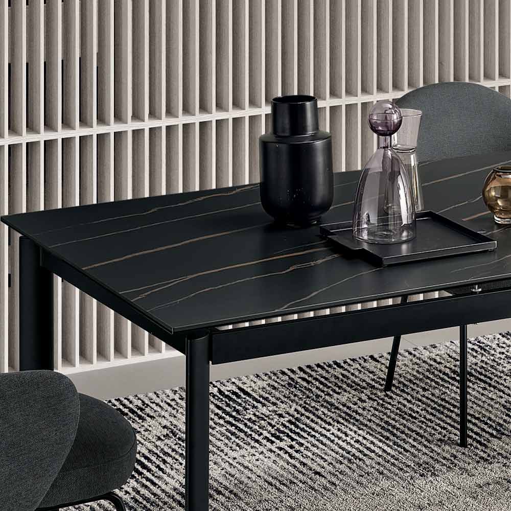 Ein eleganter Ausziehtisch im minimalistischen Design, der Ihrem Ess- oder Wohnzimmer eine stilvolle Note verleiht. Das lackierte Metallgestell trägt eine edle Tischplatte aus Feinsteinzeug in Marmoroptik , die für den praktischen und vielseitigen Gebrauch im Alltag konzipiert ist.