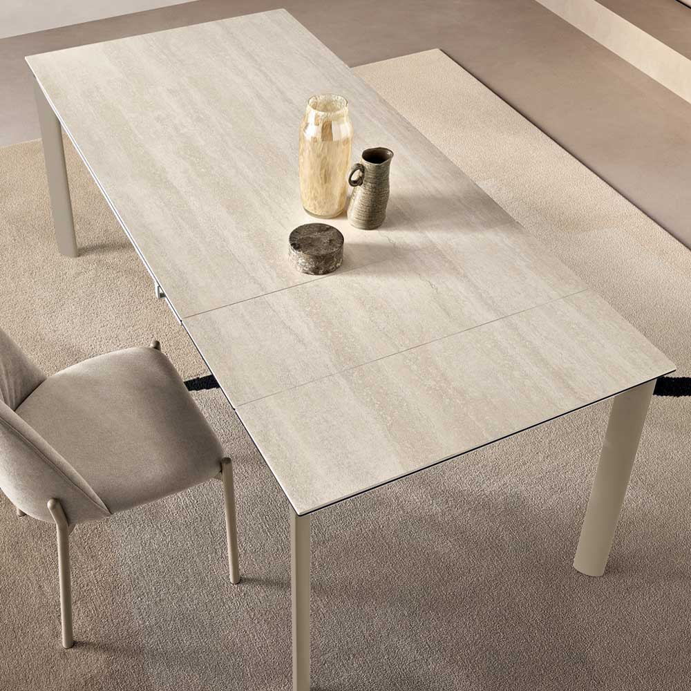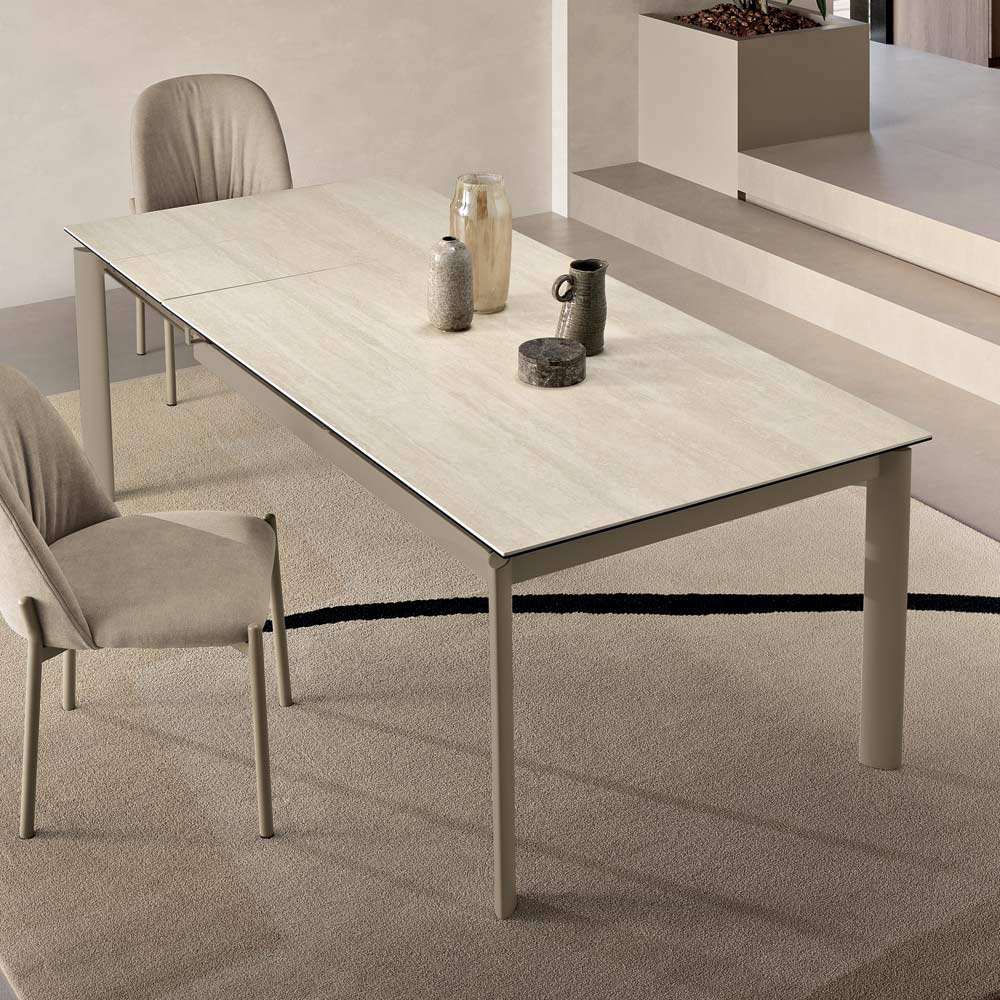 Ausgestattet mit zwei 30 cm langen Verlängerungsplatten , ermöglicht sie bei Bedarf eine Erweiterung der Oberfläche und eignet sich perfekt für Mittag- und Abendessen. Erhältlich in zwei Größen und verschiedenen Oberflächen- und Gestellkombinationen, fügt sie sich harmonisch in moderne Umgebungen ein.