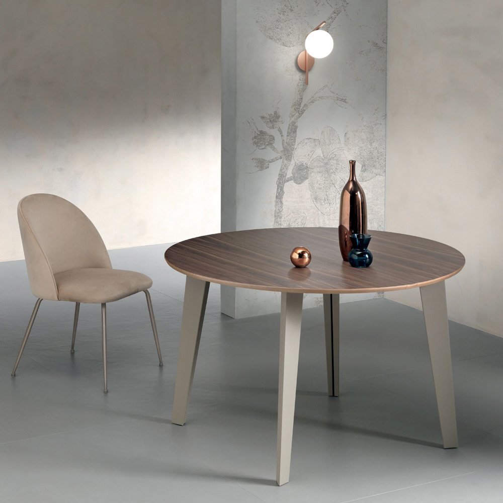 Dieser Tisch verkörpert zeitlose Eleganz und Vielseitigkeit und ist perfekt für alle, die ein Designerstück suchen, das Raffinesse und Funktionalität vereint. Die runde Tischplatte aus edlem Canaletto-Nussbaumfurnier lässt sich ausziehen und eignet sich daher ideal für intime Dinner oder größere Zusammenkünfte. Die natürliche Oberfläche unterstreicht die Schönheit des Holzes und verleiht dem Raum Wärme und Helligkeit. Die schlanke Tischplatte mit ihrer Stärke von 20 mm und die modernen Linien des Gestells mit seiner soliden und zeitgemäßen Konstruktion bilden einen perfekten Kontrast, der jeden Raum bereichert.