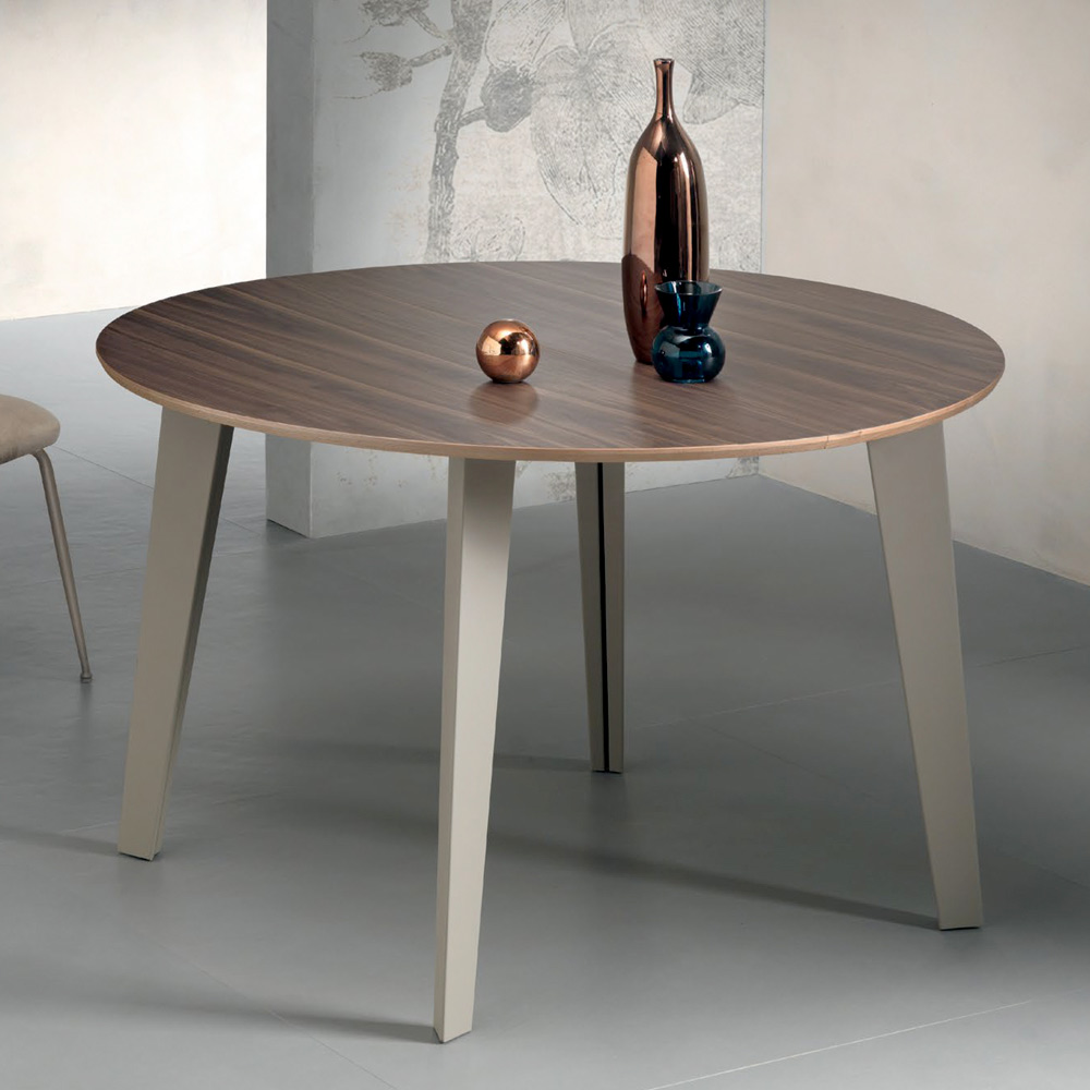 Runder Tisch, Durchmesser 120 cm, ausziehbar auf 276 oder 380 cm, mit 20 mm dicker Canaletto-Nussbaumfurnierplatte und geneigtem Profil.