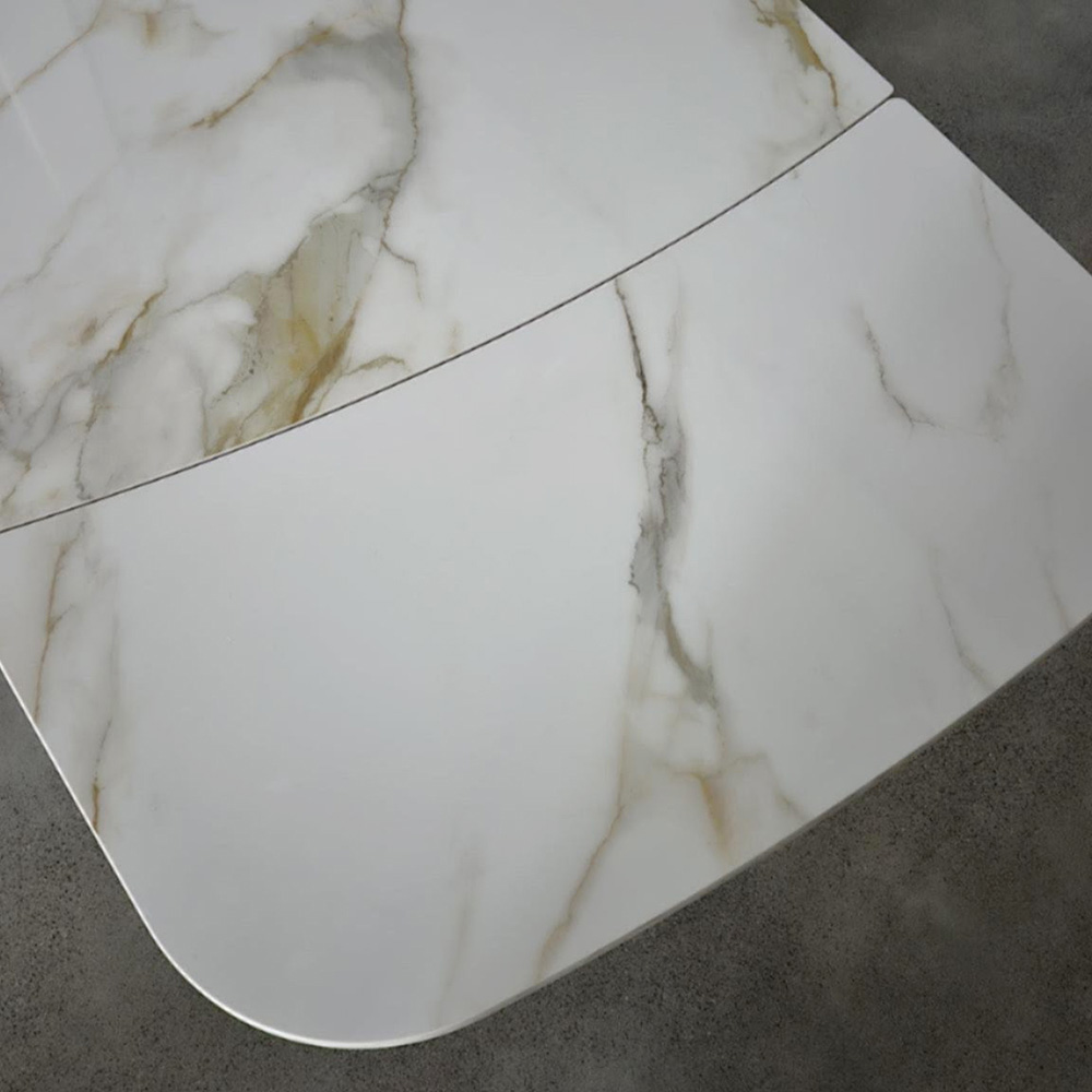 Dieser Tisch aus Steingut und Metall ist ein perfektes Beispiel für zeitgenössisches Design , das Stil und Funktionalität vereint. Die elegante und leuchtende Steingutplatte in Marmoroptik mit ihren goldenen Adern und dem glänzenden Finish, das das Licht auf natürliche Weise reflektiert, wertet den Raum auf. Das lackierte Metallgestell mit seinen asymmetrischen, skulpturalen Beinen verleiht dem Tisch Dynamik und Charakter und schafft einen harmonischen Kontrast zwischen der Solidität des Untergestells und der optischen Leichtigkeit der Tischplatte.