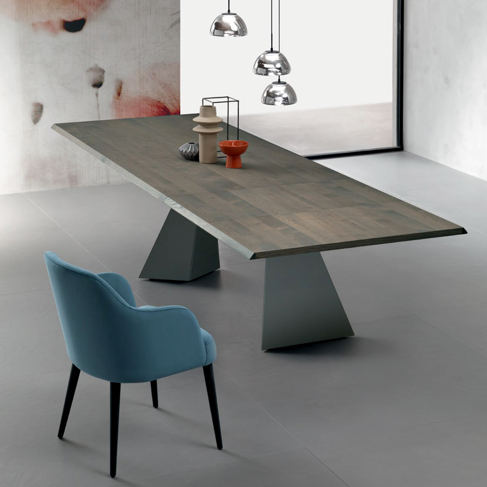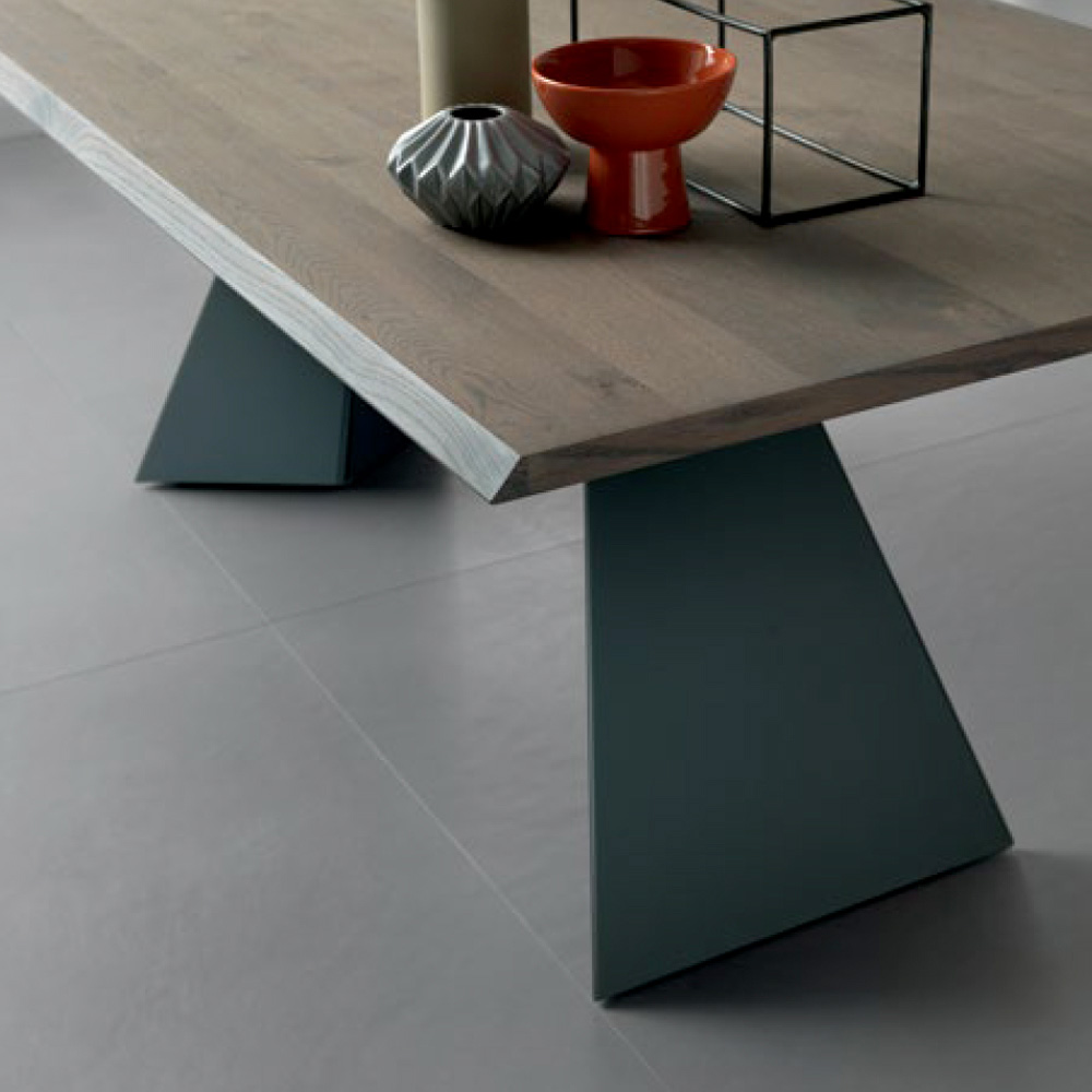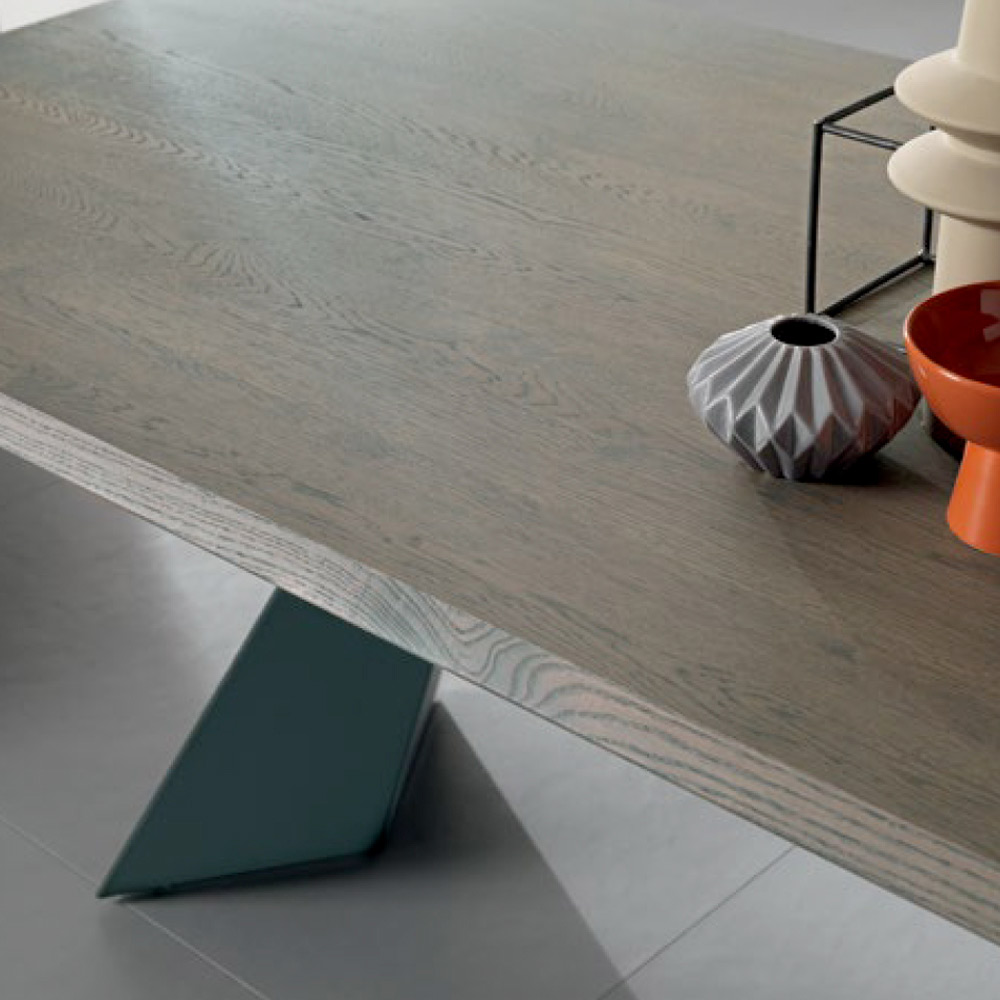Dieser Tisch vereint architektonische Kreativität mit zeitgenössischer Eleganz und verwandelt jeden Raum in einen stilvollen Ort . Die Tischplatte aus Eichenfurnier bringt die Schönheit der natürlichen Maserung voll zur Geltung, während die dünne, leicht abgeschrägte Kante für optische Leichtigkeit und einen Hauch von Modernität sorgt.
