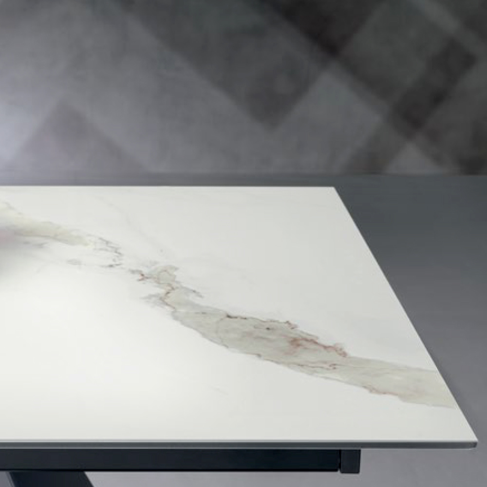 Dieser Tisch vereint architektonische Kreativität mit zeitgenössischer Eleganz und verwandelt jeden Raum in einen stilvollen Ort . Die 10 mm dicke Glaskeramikplatte mit polierter Calacatta-Gold-Oberfläche bringt die natürliche Schönheit der Maserung perfekt zur Geltung, während die dünne, leicht abgeschrägte Kante für optische Leichtigkeit und einen Hauch von Modernität sorgt.