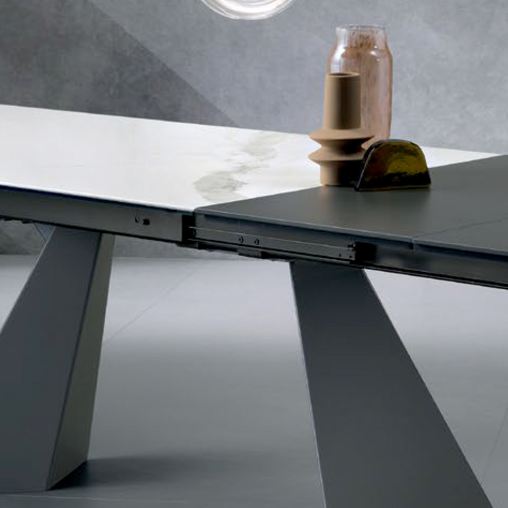 Ausziehbarer rechteckiger Tisch mit 10/11 mm dicker Glaskeramikplatte.