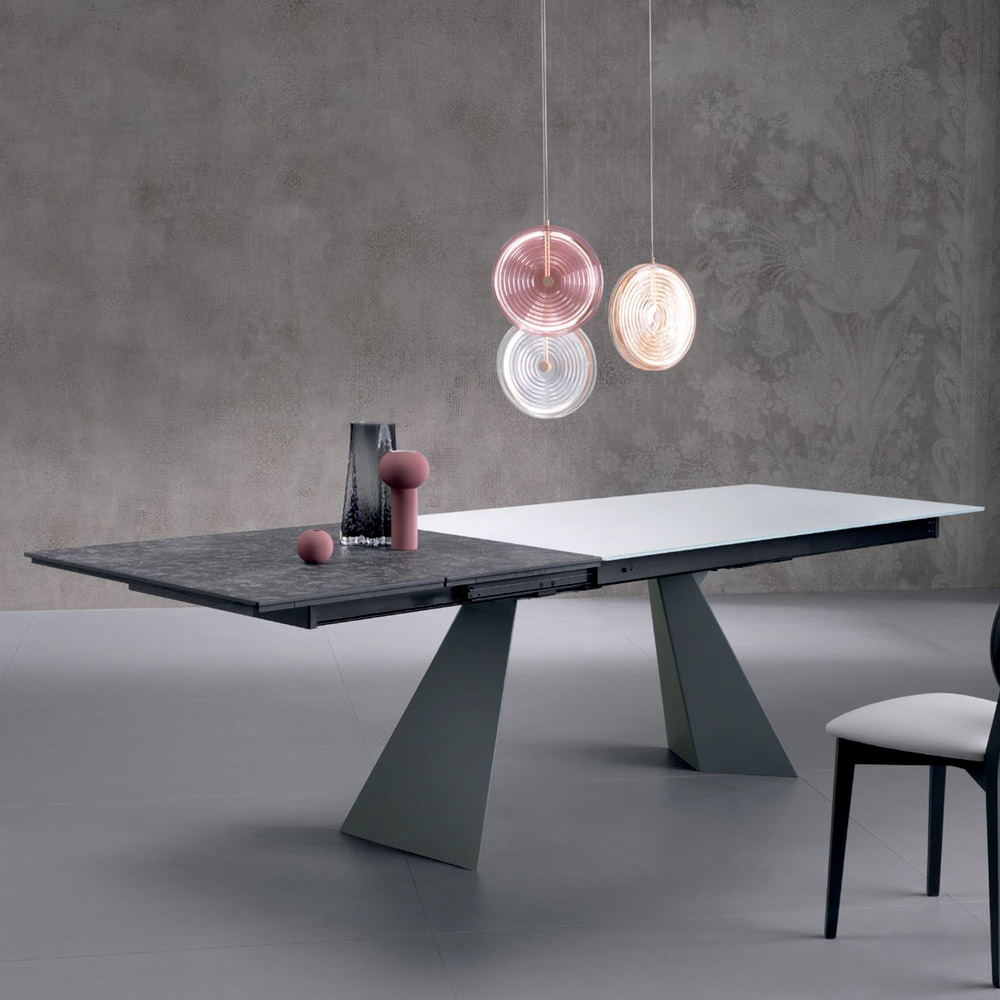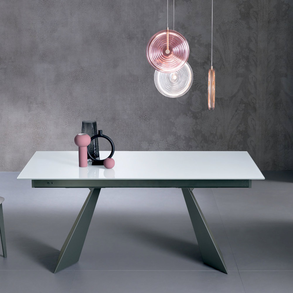 Dieser Tisch vereint architektonische Kreativität und zeitgenössische Eleganz und verwandelt jeden Raum in einen stilvollen Ort . Die 10 mm dicke Milchglasplatte verkörpert pure Eleganz. , während der dünne und leicht geneigte Rand für optische Leichtigkeit und einen Hauch von Modernität sorgt.