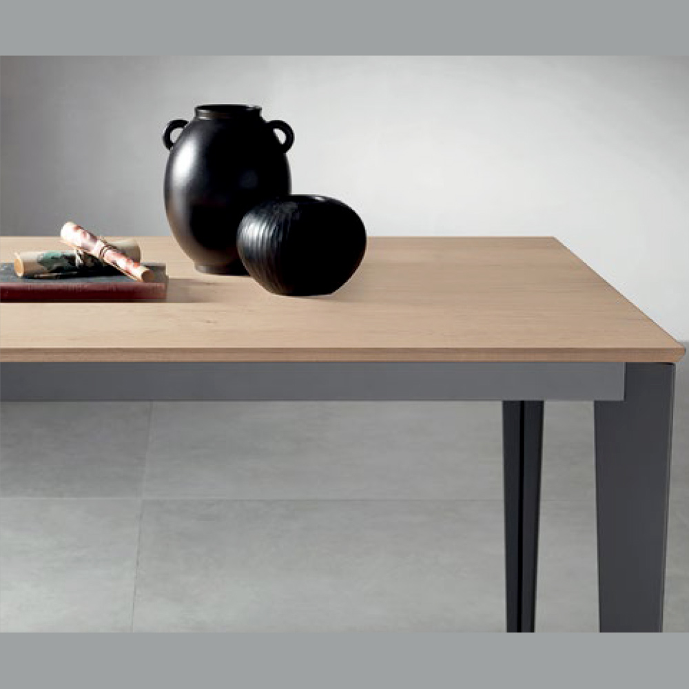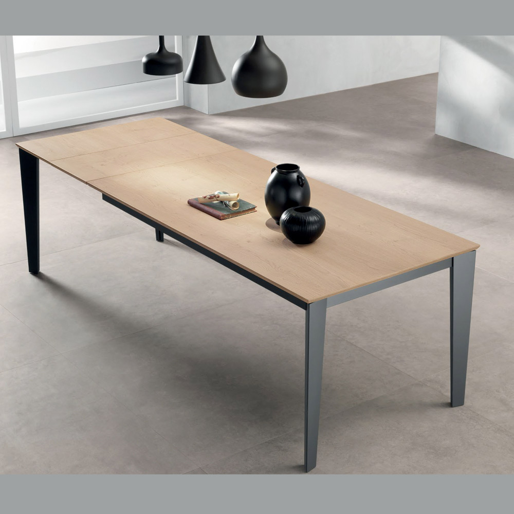 Elegant und funktional vereint dieser ausziehbare rechteckige Tisch modernes Design mit praktischer Handhabung. Die 22 mm dicke Tischplatte aus naturbelassenem Eichenfurnier bringt die warme, authentische Maserung des Holzes optimal zur Geltung, während die anthrazitfarbenen Metallbeine für Stabilität und einen zeitgemäßen Akzent sorgen.