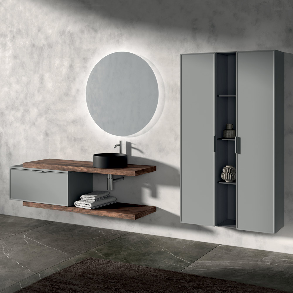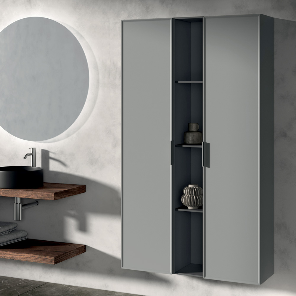 Die Komposition wird durch vertikale Aufbewahrungssäulen und ein anthrazitfarbenes offenes Element bereichert, das sich perfekt zur Organisation von Accessoires und Gegenständen eignet und gleichzeitig einen ordentlichen und zeitgemäßen Stil bewahrt.