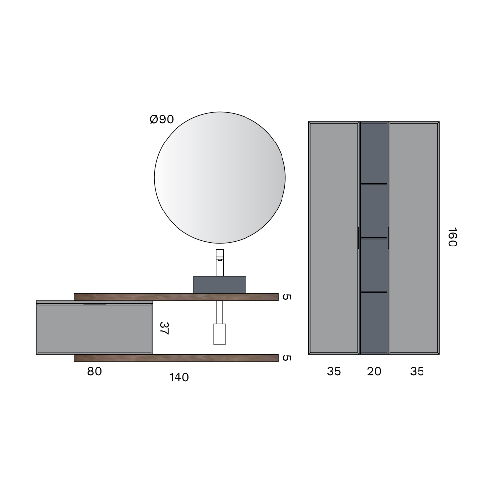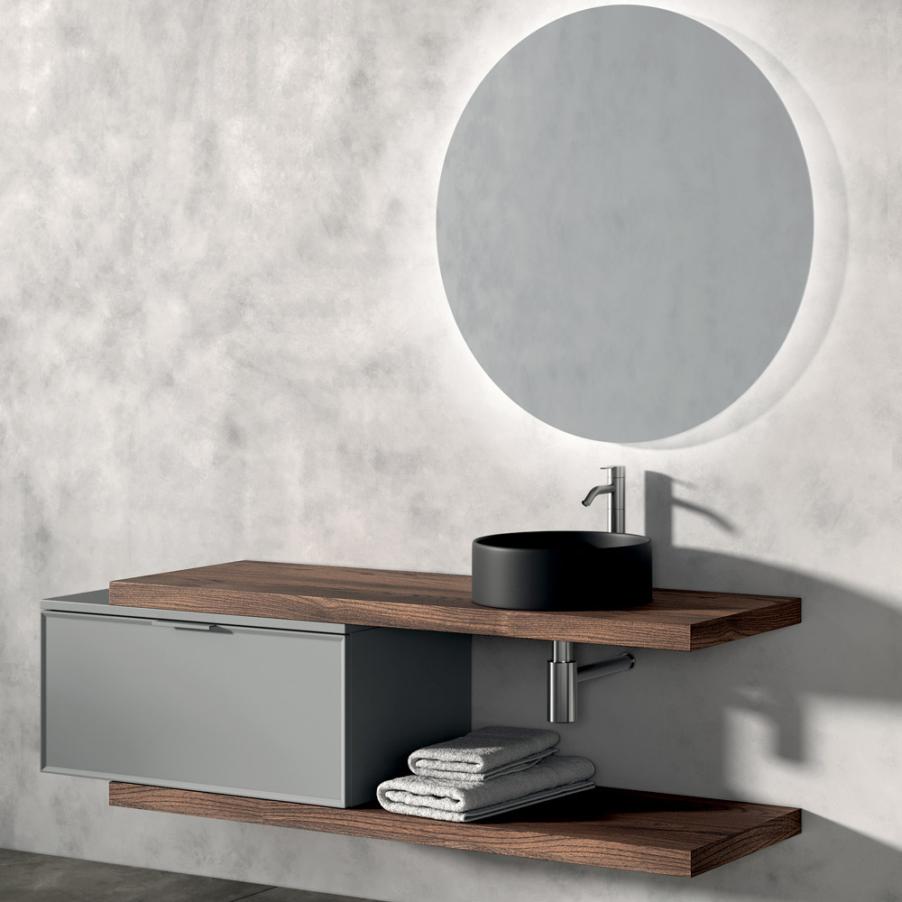 Die beiden Arbeitsplatten aus Rio-Eiche bringen ein natürliches und warmes Element ein und bilden einen angenehmen Materialkontrast zum runden Aufsatzwaschbecken aus mattschwarzer Keramik , dem eigentlichen optischen Protagonisten der Komposition.