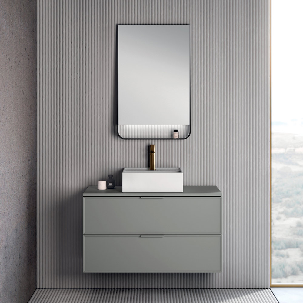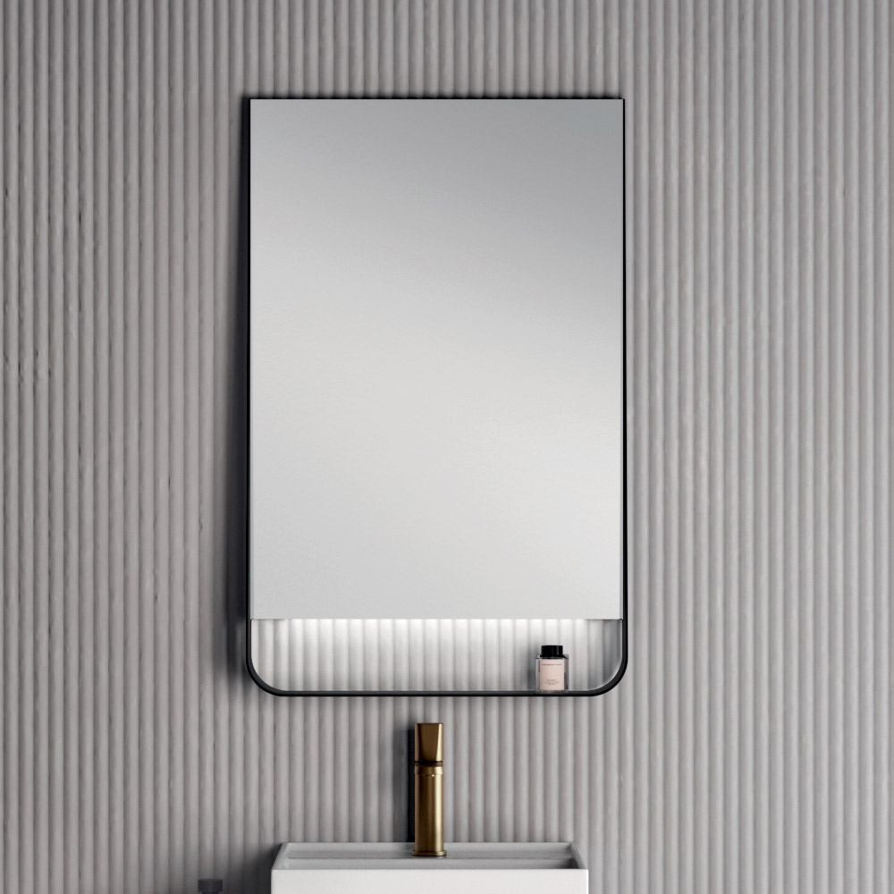 Der LED-Badezimmerspiegel Wing mit mattschwarzem Rahmen rundet das Ensemble ab. Er ist ein Element mit starker Persönlichkeit, das für eine funktionale und zugleich dekorative Beleuchtung sorgt und den gesamten Waschbeckenbereich aufwertet.