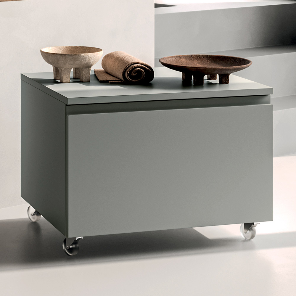 Der Unterschrank mit Schublade bietet praktischen und übersichtlichen Stauraum und sorgt so für Ordnung, ohne dabei auf Ästhetik zu verzichten. Die matte, graue Oberfläche verleiht ihm eine strukturierte, moderne Optik, die sich harmonisch in verschiedene Einrichtungsstile einfügt. Dank der Rollen lässt sich der Schrank flexibel positionieren und eignet sich ideal für moderne Badezimmer, Objektprojekte oder unkonventionelle Einrichtungslösungen.