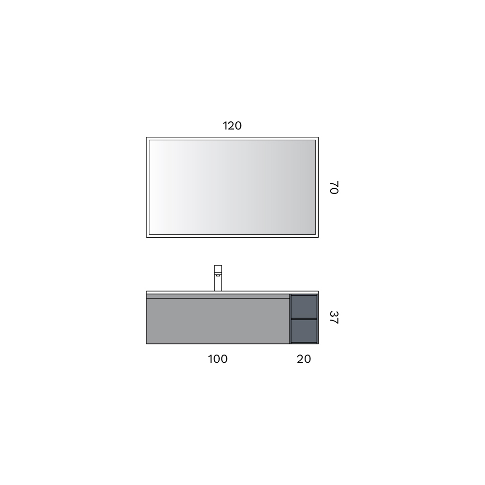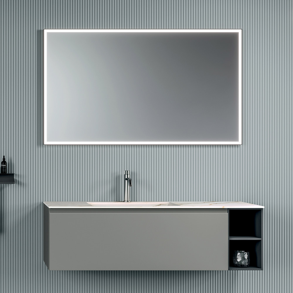 Die Komposition wird durch den hinterleuchteten LED-Spiegel vervollständigt, der ein gleichmäßiges und einhüllendes Licht bietet und sich perfekt eignet, um den Badezimmerraum aufzuwerten und eine funktionale und elegante Beleuchtung zu gewährleisten.