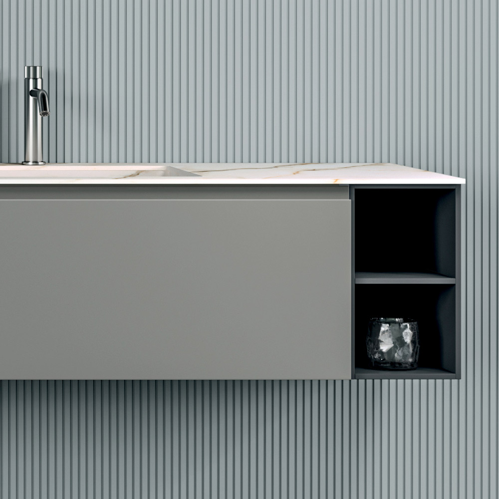 Die Komposition besticht durch zeitgenössische Eleganz mit klaren Linien, schwebenden Formen und hochwertigen Materialien. Ein Badezimmermöbelstück für anspruchsvolle Räume, in dem Design und Alltagstauglichkeit Hand in Hand gehen.
