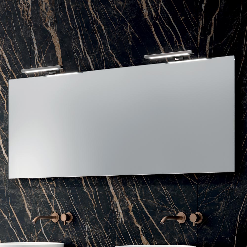 Der rechteckige Spiegel verstärkt die Helligkeit und verleiht dem Raum Tiefe, während die verchromten LED-Lampen für eine elegante und funktionale Beleuchtung sorgen, die den Waschbeckenbereich perfekt in Szene setzt.