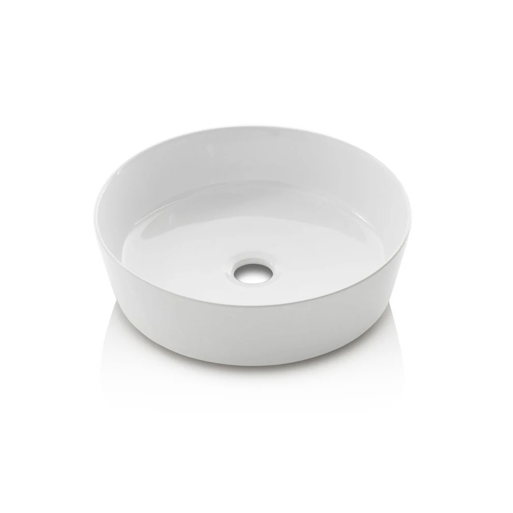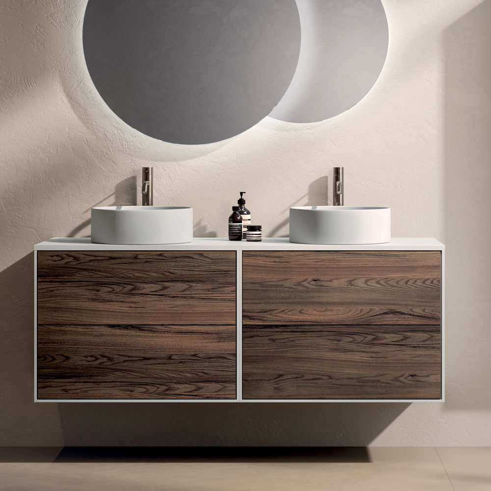 Die runden, glänzend weißen Keramikwaschbecken heben sich elegant aus der Oberfläche ab, unterstreichen die optische Leichtigkeit des Gesamtdesigns und bieten eine ideale Lösung für gemeinsam genutzte Räume. Ihre weichen Formen harmonieren perfekt mit den klaren Linien des wandhängenden Schranks.