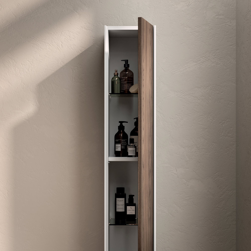 Die dazu passende Säule vervollständigt die Komposition und verleiht dem Badezimmerprojekt, das für all jene konzipiert wurde, die Wert auf Eleganz, Praktikabilität und ästhetische Kohärenz legen, Vertikalität und Ordnung.