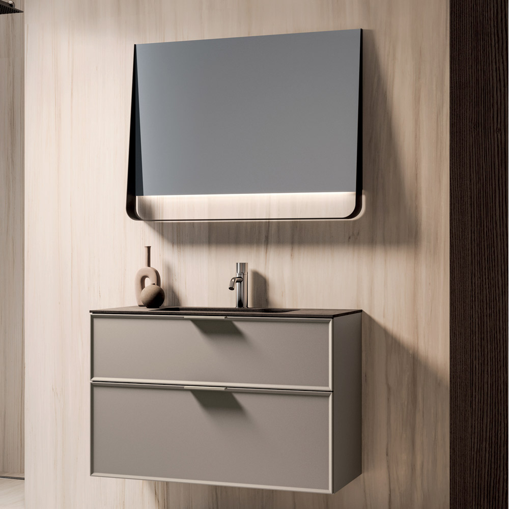 Die Komposition wird durch den Wing LED-Spiegel mit mattschwarzem Rahmen vervollständigt, der für eine gleichmäßige und funktionale Beleuchtung sorgt und sich ideal für den Waschbeckenbereich eignet sowie den Sehkomfort verbessert.