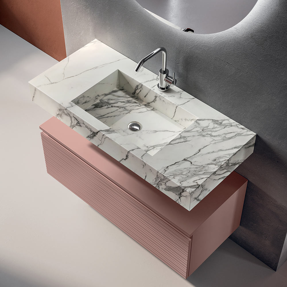 Die HPL-Waschtischplatte in Calacatta-Optik setzt einen Materialakzent mit großer optischer Wirkung: Die marmorähnliche Ästhetik verleiht Helligkeit und Wertigkeit und gewährleistet gleichzeitig hohe Leistungsfähigkeit in Bezug auf Widerstandsfähigkeit und Alltagstauglichkeit.