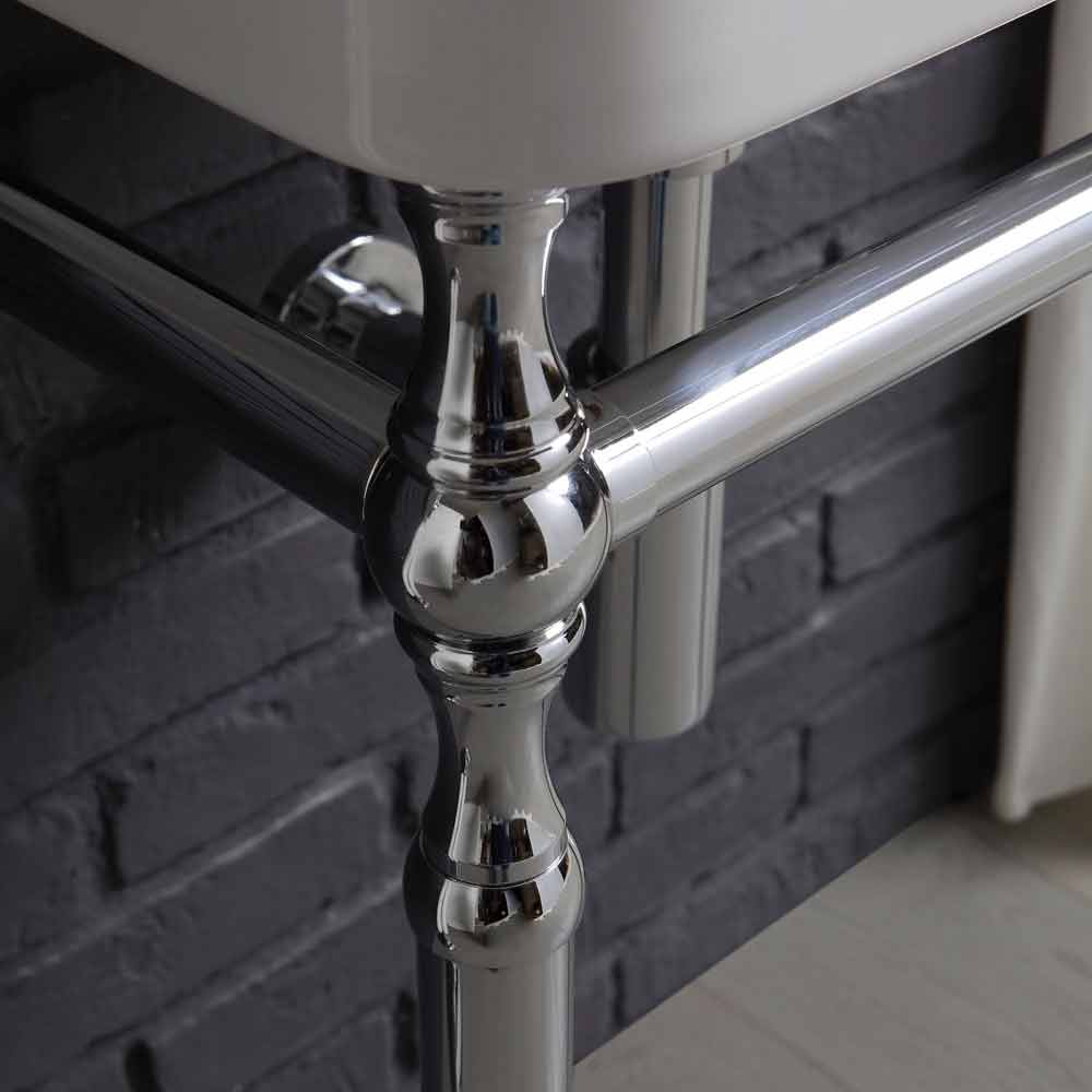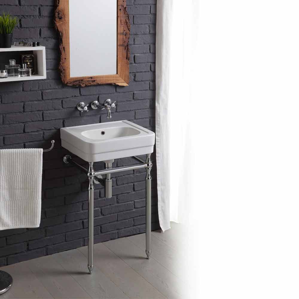 In der Komposition enthaltene Teile: - Waschbecken cm. L. 50 cm x D. 40,5 cm - Breite der Chrommetallbasis. 41 cm x Wandvorsprung 34 cm x H: 76 cm - Chrom Wandhahn - Chromablauf - Chrom-Siphon - Freistehender Handtuchhalter aus Chrom, Toilettenpapierhalter und Toilettenbürstenhalter aus Chromkeramik. - Spiegel mit antikem Briccola-Holzrahmen 55x75 cm