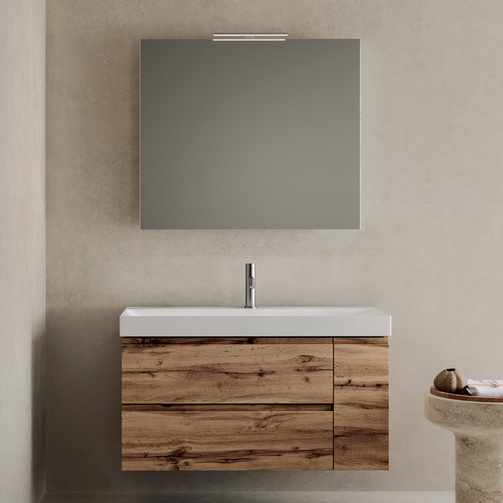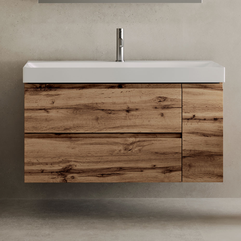 Der Unterschrank mit zwei Schubladen und einer Seitentür bietet praktischen Stauraum und vereint Alltagstauglichkeit mit einer klaren Ästhetik. Die geradlinige und schwebende Konstruktion lässt das Badezimmer optisch leichter wirken.