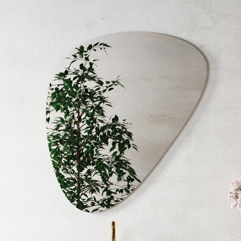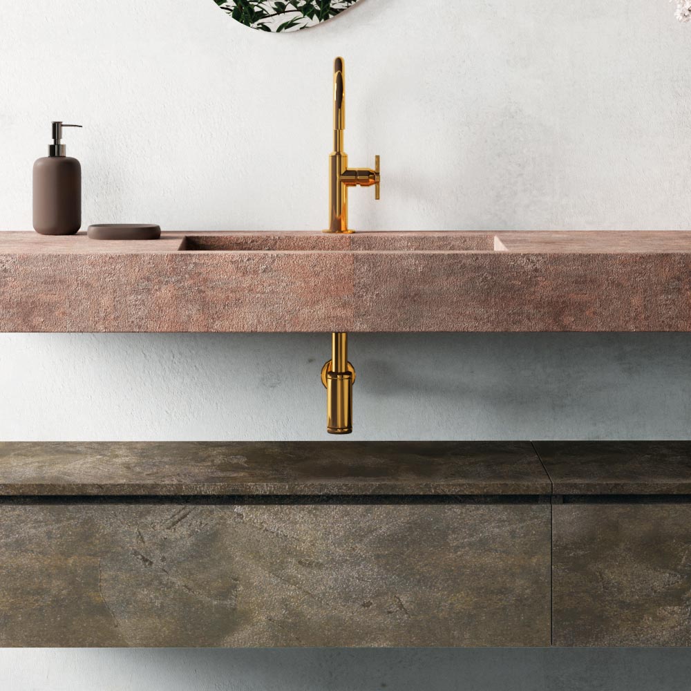 Badezimmerkomposition bestehend aus einem modernen Spiegel und einem cortenfarbenen Konsolenwaschbecken Basis in Lavasteinfarbe.