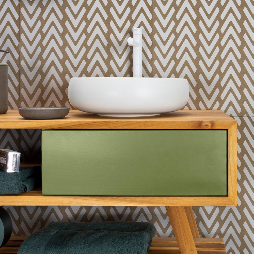 Der freistehende Badezimmerschrank mit Struktur aus recyceltemNaturteak ist eine exklusive Kombination aus einer praktischen und eleganten Platte und 2 Schubladen aus grünemMahagoniholz , einem Farbton, der in jedem Detail an den Orient erinnert. Eine bewusst grafische Ästhetik, die durch die Kombination der Doppelschublade für die Fassade noch verstärkt wird.