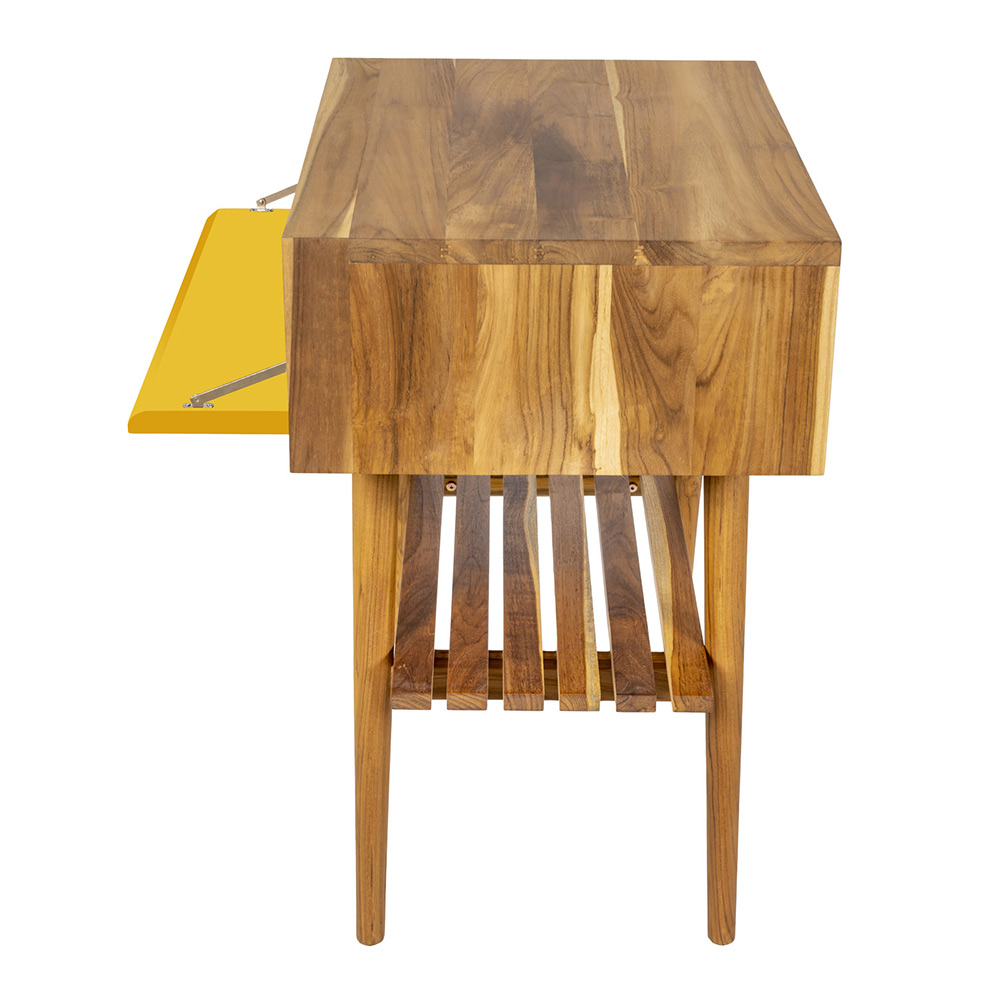 Badezimmerschrank aus natürlichem Teakholz mit gelber Mahagonischublade.