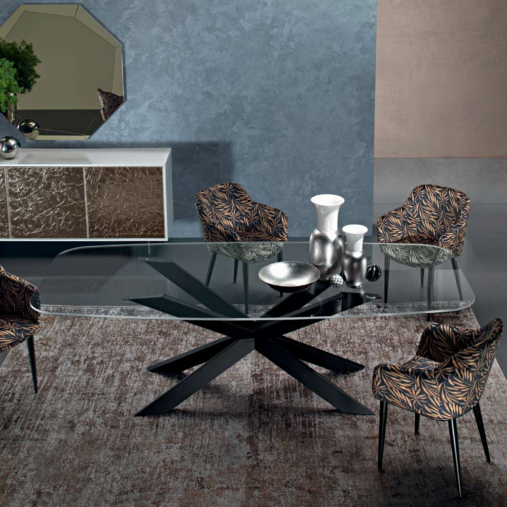 In Italien hergestellter Esstisch mit tonnenförmiger Platte aus transparentem, extraklarem Hartglas (12 mm dick) und lackiertem Stahlgestell . Ein raffiniertes Einrichtungsaccessoire, das dank seines faszinierenden Designs und seiner originellen Form die Aufmerksamkeit auf sich zieht und jeder modernen Einrichtung eine exklusive Note verleiht. Die herrliche Kombination aus der zeitlosen Eleganz von Glas und der originellen Form der Fassplatte erweckt einen Esstisch mit einer raffinierten Seele zum Leben, der den umgebenden Stil mit einer einzigartigen und modernen Note vervollständigt. So entsteht eine Einrichtungslösung mit klassischer Ästhetik, ideal für diejenigen, die einen anspruchsvollen Geschmack lieben, aber nicht auf grundlegende Aspekte wie Qualität und Langlebigkeit verzichten möchten.