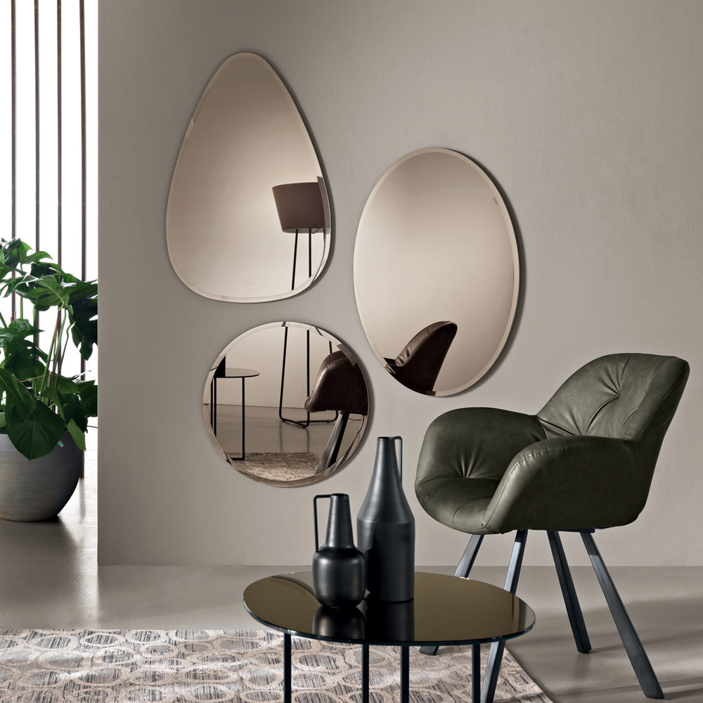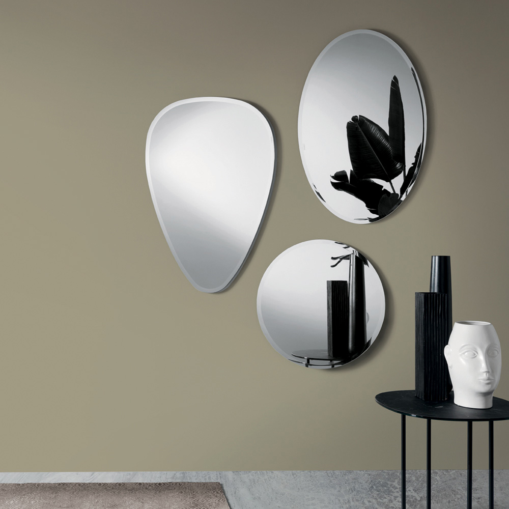 Jedes Element ist mit einer abgeschrägten Kante versehen, die die Silhouette des Spiegels betont und seine Leuchtkraft verstärkt. Die drei Formen lassen sich zu einer eleganten und modernen Komposition kombinieren, die die Wand in ein harmonisches Zusammenspiel von Spiegelungen und dekorativen geometrischen Formen verwandelt.