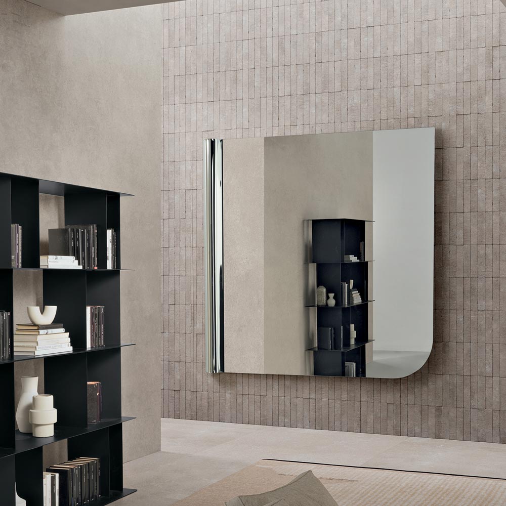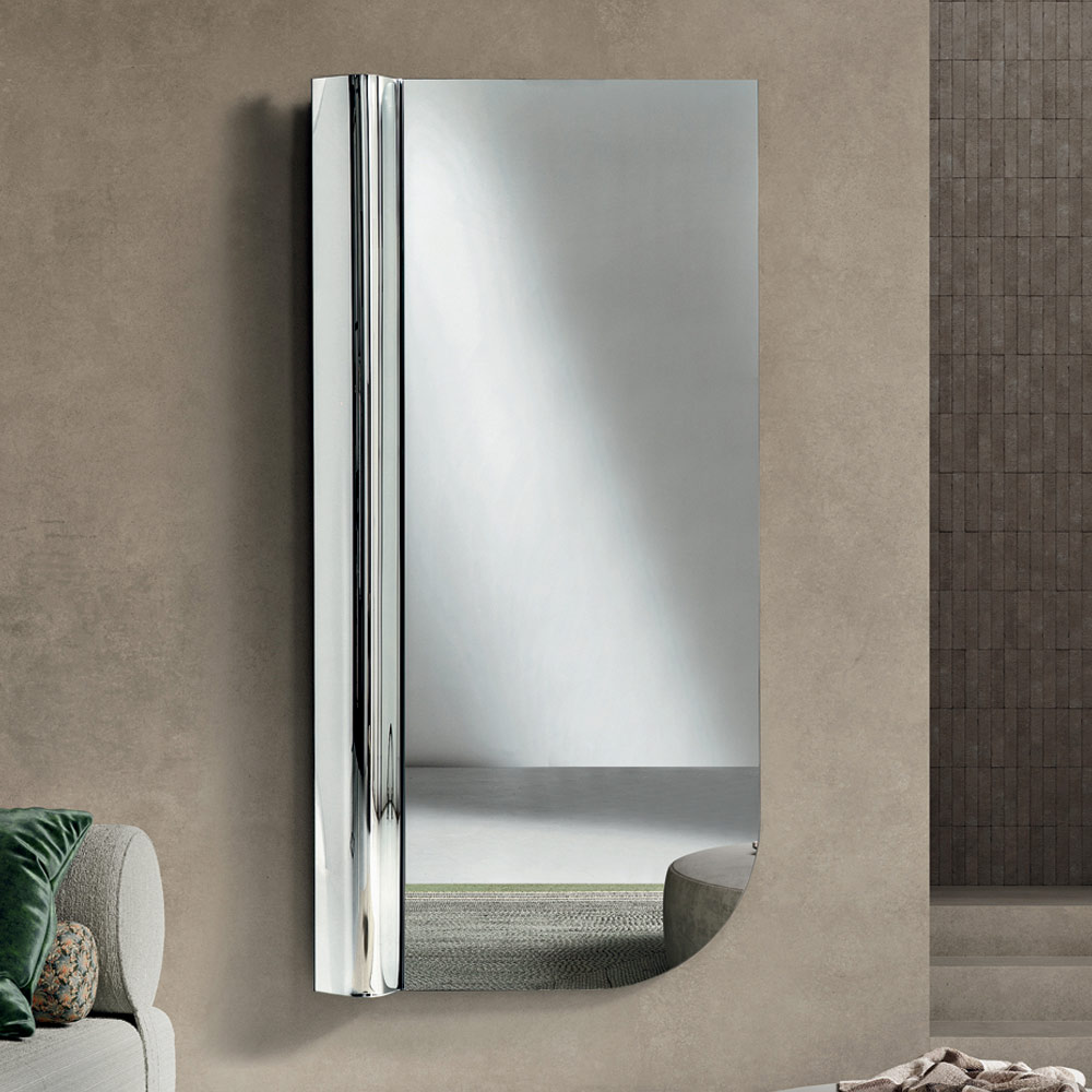 Das ausgewogene Verhältnis zwischen sanfter Asymmetrie und klaren Linien macht diesen Spiegel zu einem raffinierten Einrichtungsaccessoire, das die Wand mit einem modernen grafischen Element bereichert und die Helligkeit des Raumes verstärkt.