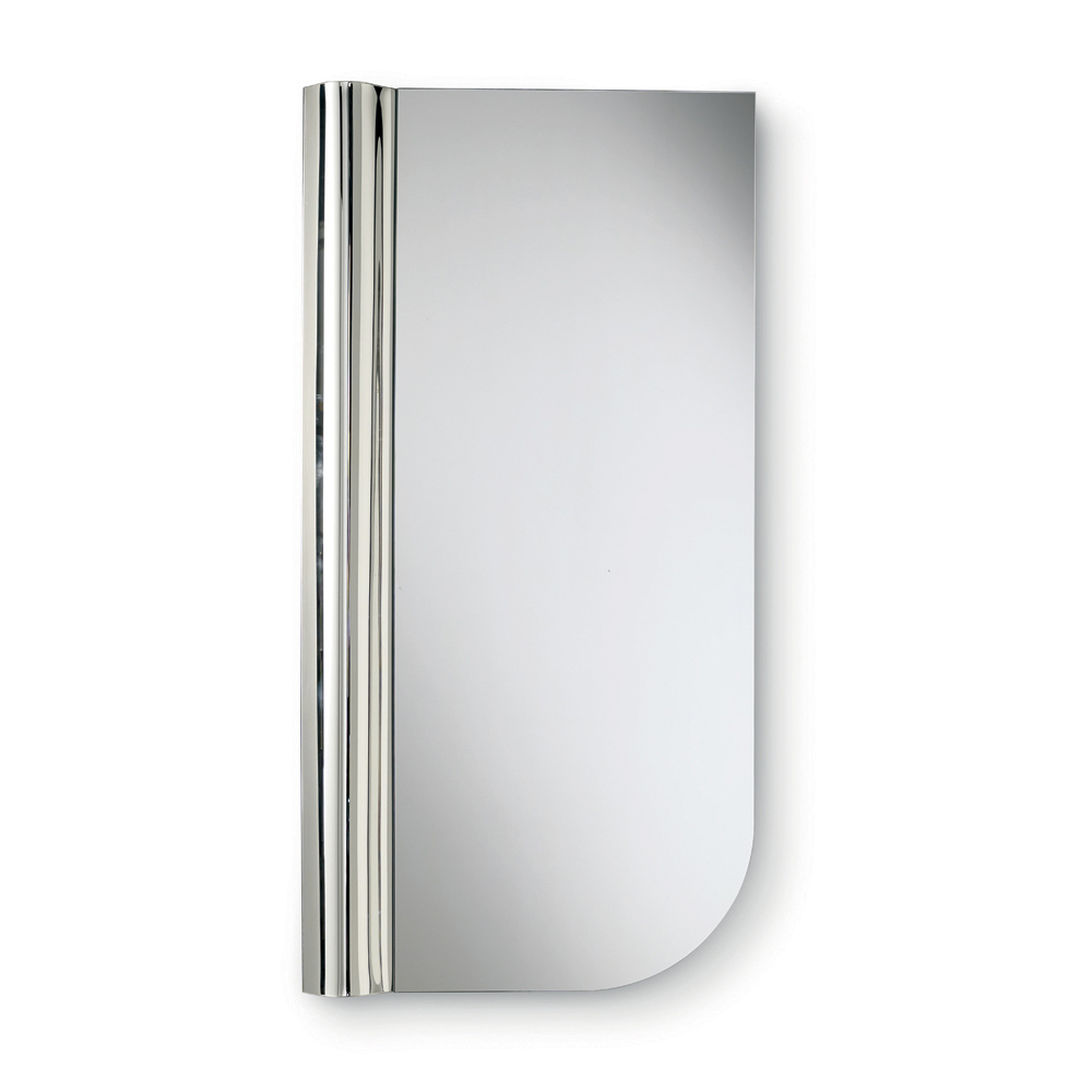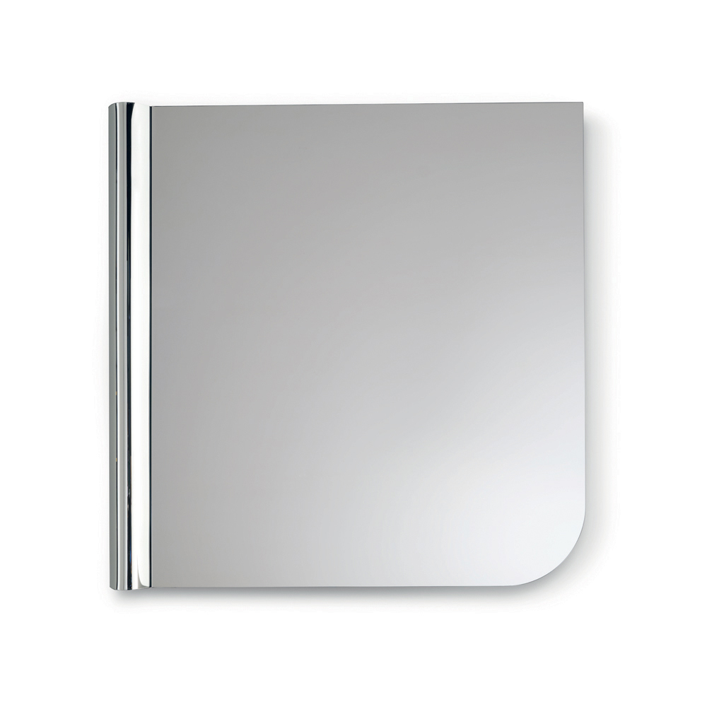 Die Form des Spiegels zeichnet sich durch klare Linien und eine abgerundete Ecke aus, die das Profil des Glases weicher wirken lässt. Im Kontrast zu dieser klaren Geometrie steht eine Welle aus geschmolzenem Glas, die sich entlang einer vertikalen Seite erstreckt – ein strukturiertes Detail, das der Oberfläche Dynamik verleiht und ein elegantes Spiel von Licht und Reflexionen erzeugt.