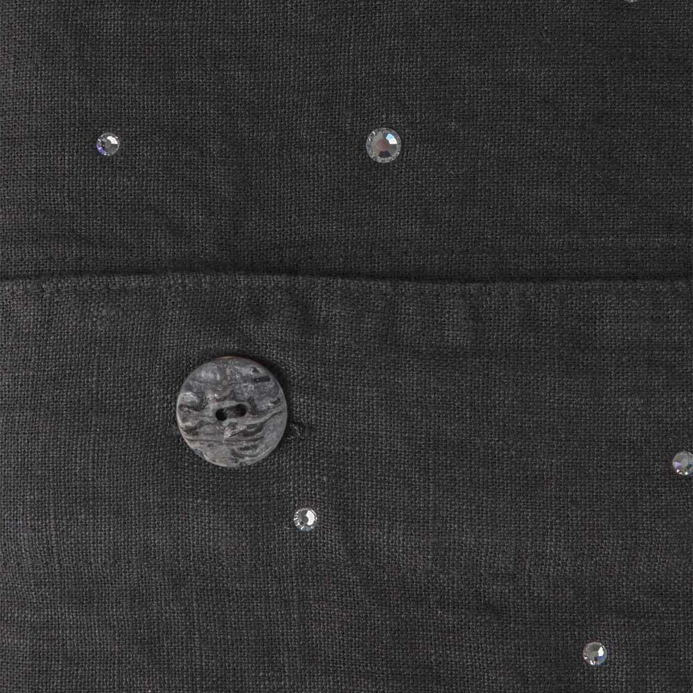 Der Wert der Tradition verbindet den modernen Lebensstil mit dieser schwarzen Leinen-Containertasche, die mit Kristallen besetzt ist und mit Agoya-Knöpfen aus Perlmutt und Klappe verschlossen ist.