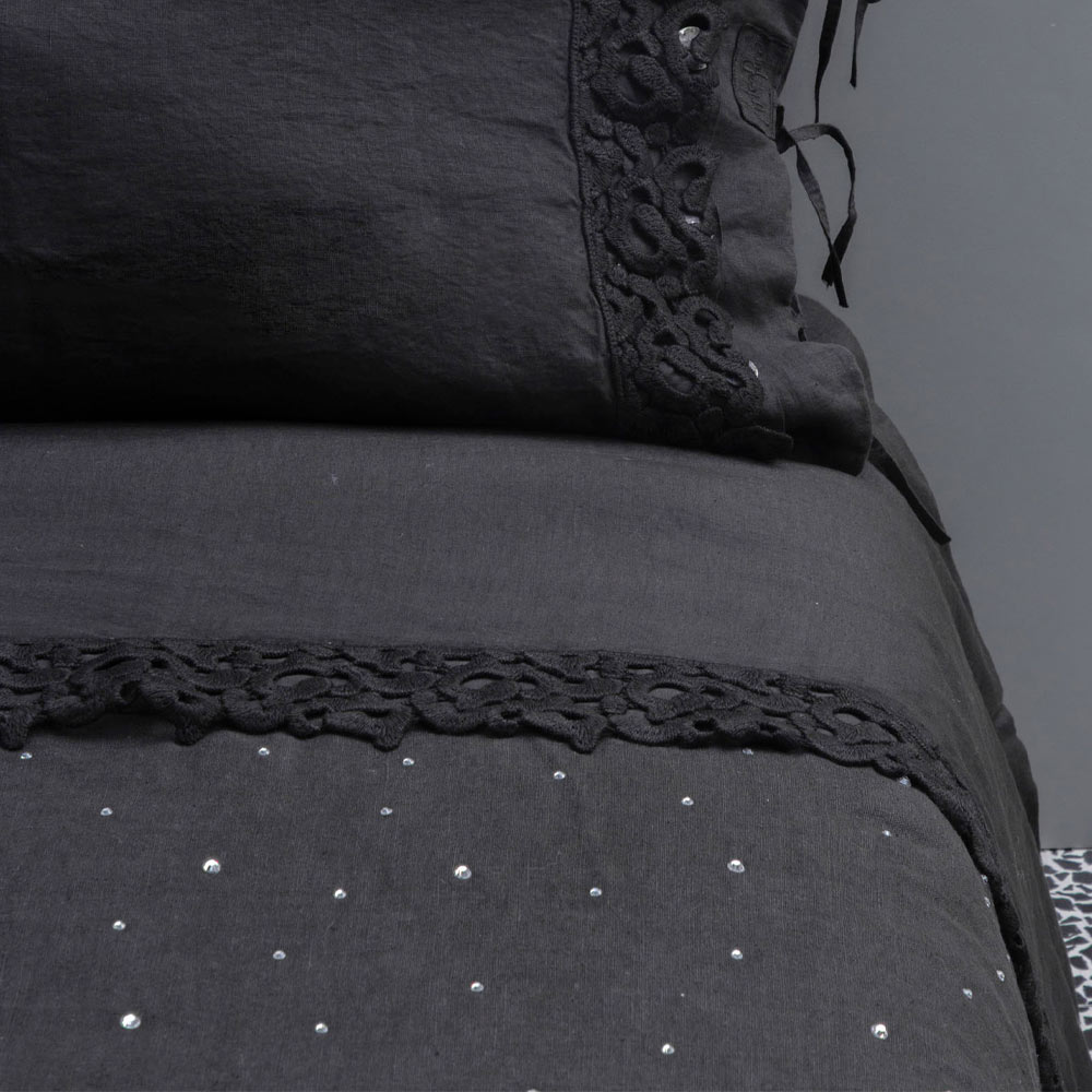 Doppelter Bettbezug aus schwarzem Leinen mit Kristallen, Knöpfen und Luxusklappe made in Italy.