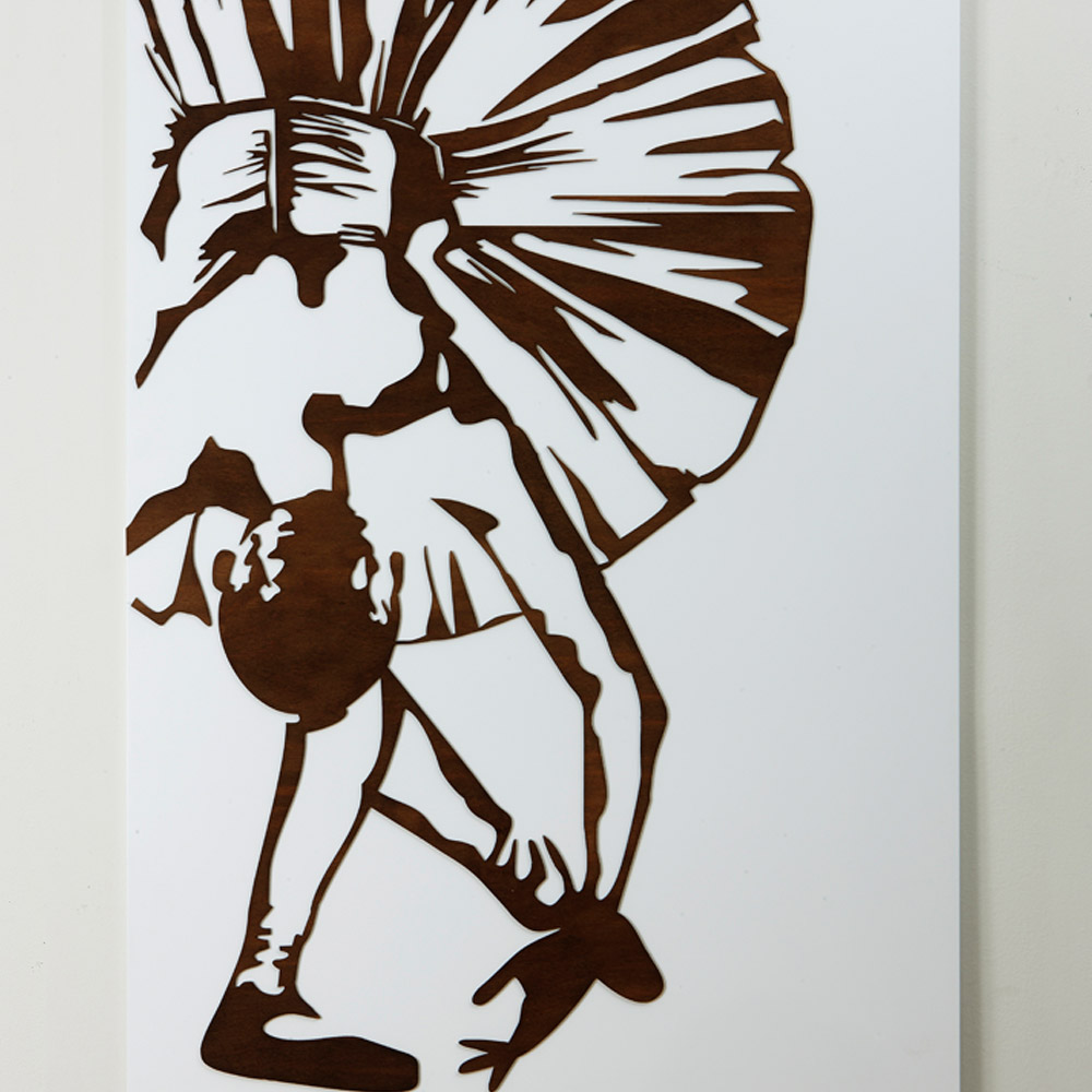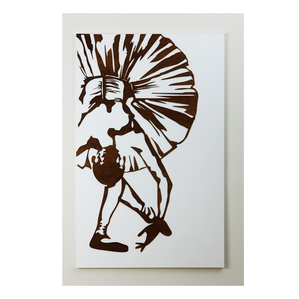Die dekorative Platte wird mithilfe der Lasermarkierungstechnik hergestellt, die ein Flachrelief auf dem Material erzeugt und so verschiedene Farbabstufungen auf der Platte erzeugt. Das Gestell besteht aus weiß lackiertem Holz mit wengefarbenen Applikationen.