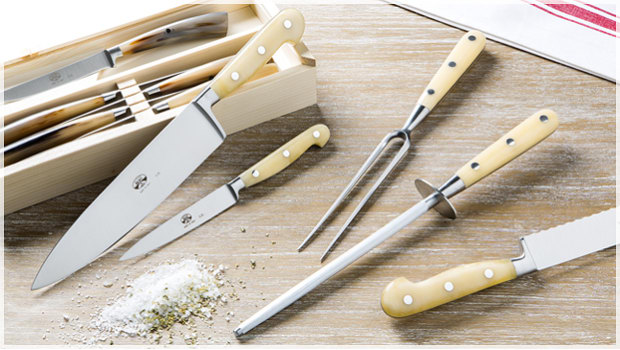 historischen Besteck zusammen, dessen Geschichte 1895 mit einem Familienmanagement und einer handwerklichen Produktion hochwertiger Messer beginnt.