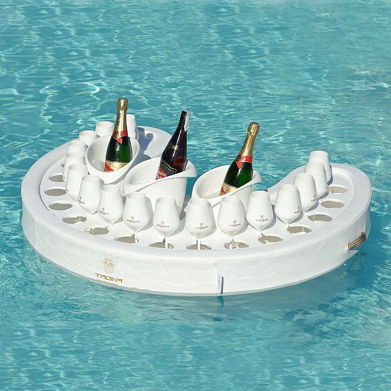 Neue Sommertrends für Spaß am Strand und im Pool. Schwimmende Sessel und schwimmende Stangen aus nautischem Öko-Leder organisieren Partys mit Freunden.