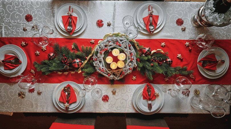 Unumgängliches Rot, Grün und Gold, die schon immer die typischen Farben des Weihnachtstisches waren, vielseitig und einfach mit Tischdecken, Tellersets und Mittelstücken zu kombinieren.