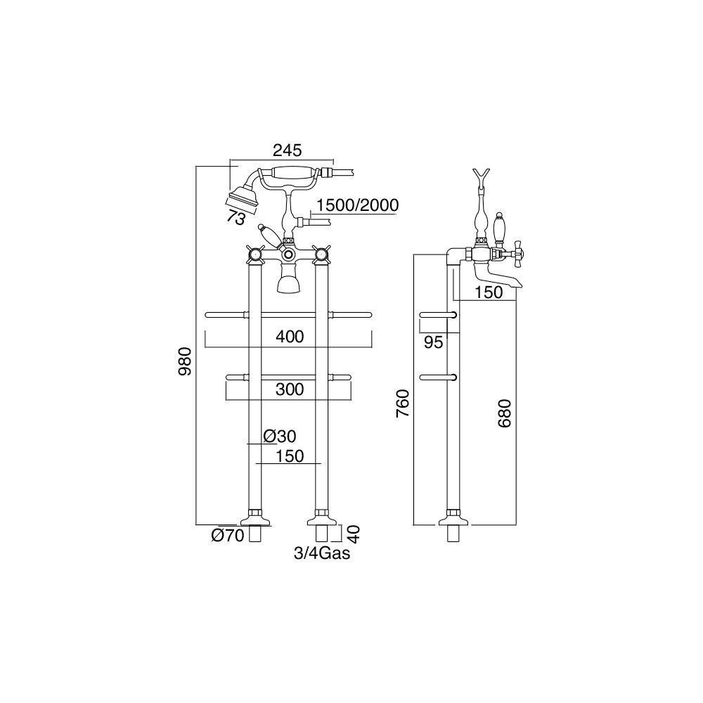 bodenstehende Badewannengruppe mit Handtuchhalter, Handbrause und Schlauch.