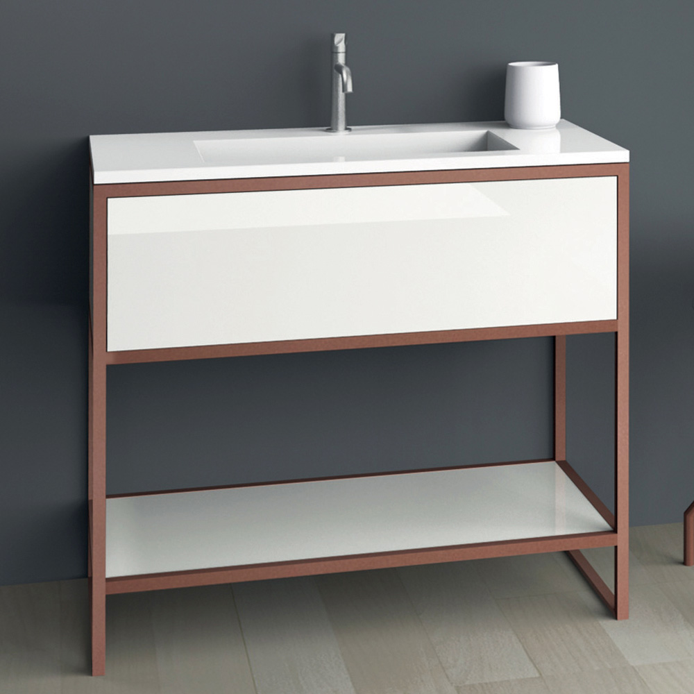 Badmöbellinie zeichnet sich durch eine Struktur aus einem dünnen, matt kupferlackierten Metallprofil aus, das die Türen und das Regal aus glänzend weiß lackiertem MDF einrahmt und eine harmonische Kombination aus vollen und leeren Räumen schafft. Die Metalloberflächen der Türen unterstreichen den