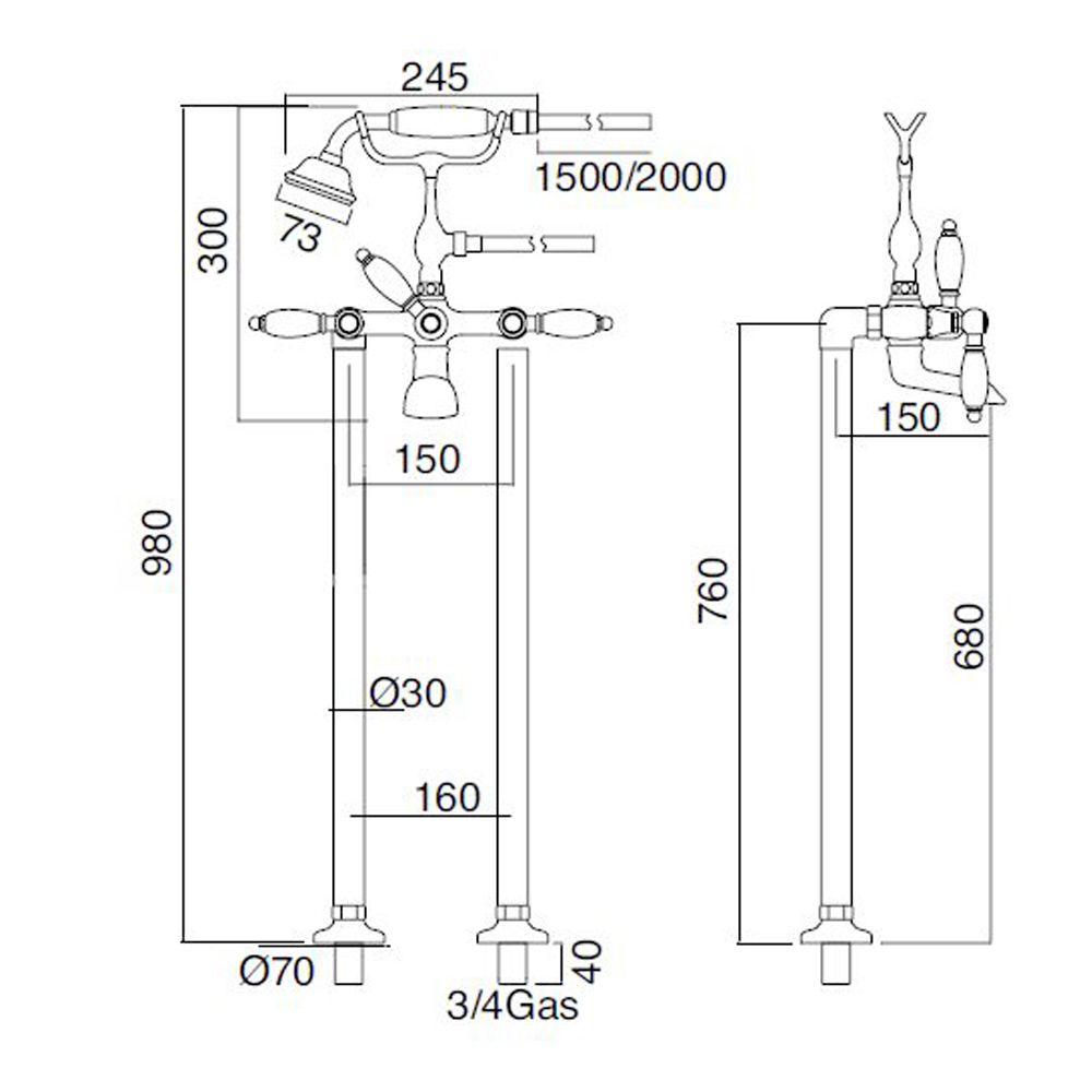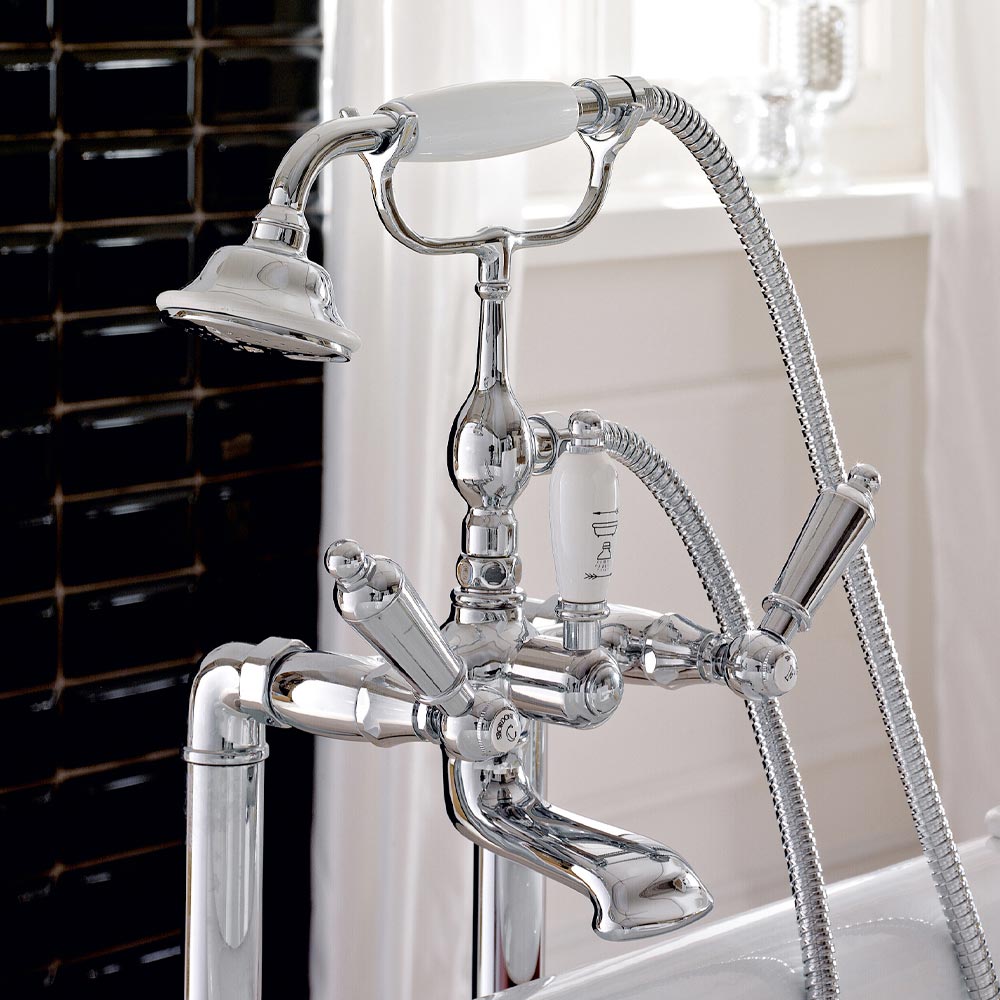 Bodenstehende Badewannenarmatur mit Hebeln im klassischen Stil, Luxusartikel made in Italy.