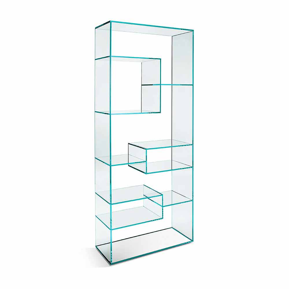 Dieses Vitrinen-Bücherregal zeichnet sich durch sein entschlossenes und elegantes Design aus, das vollständig aus extra klarem Glas besteht.