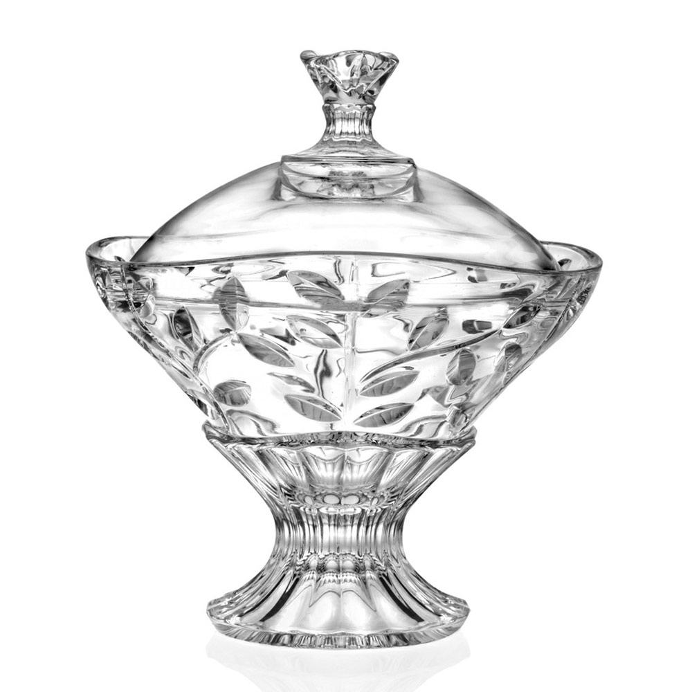 Tafelaufsatz und Schüssel für Bonbons mit Deckel aus Öko-Kristall verziert mit Blatt, 2 Stück made in Italy.