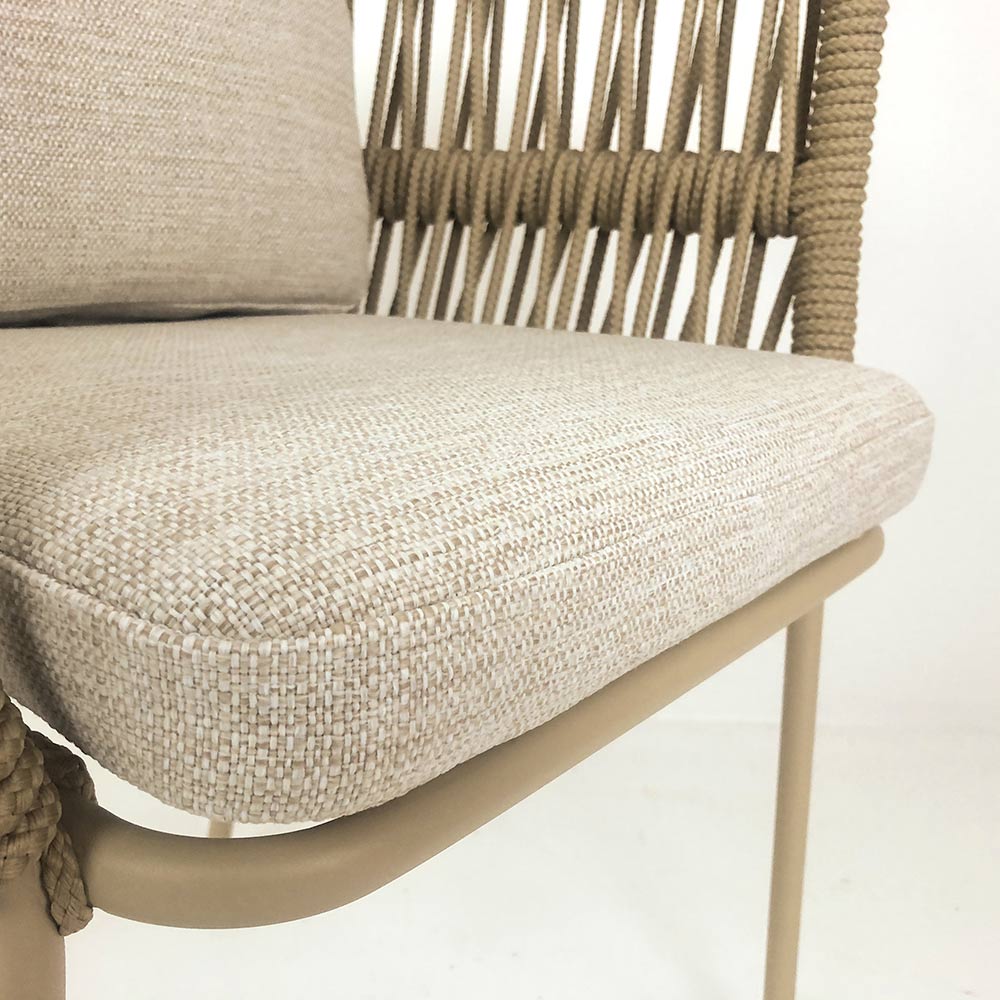 Der Esszimmersessel Cliff verfügt über ein Gestell aus beigefarbenem Kunstfaserseil und Kissen aus 100% PP-Gewebe mit abnehmbaren Bezügen in der gleichen Farbe, die mit Trockenschaum gepolstert sind. Synthetisches Seil ist ein doppelt geflochtenes Material mit einem Polyesterkern und einer Multifilament-Propylen-Ummantelung. Die äußere Faser ist wasserdicht und UV-beständig.